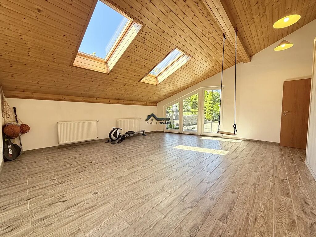 •	Přízemí: prostorný obývací pokoj s krbem a plně integrovaným systémem domácího kina s rozvody pro prostorový zvuk, kuchyň s jídelnou a spíží, dvě ložnice, koupelna, samostatné WC, technická místnost s FVE a tepelným čerpadlem, garáž s centrálním vysavačem, infra sauna a prostorná místnost, kterou si můžete přizpůsobit podle svých potřeb – ať už toužíte po domácí posilovně, relaxační zóně se zelení nebo místě pro rodinnou zábavu.