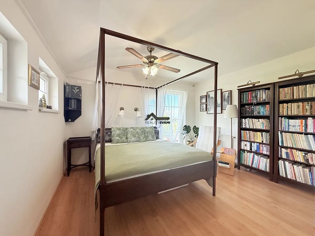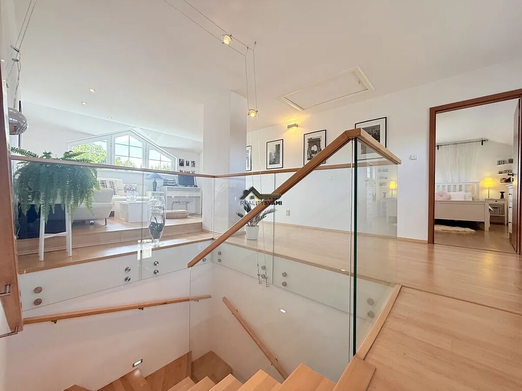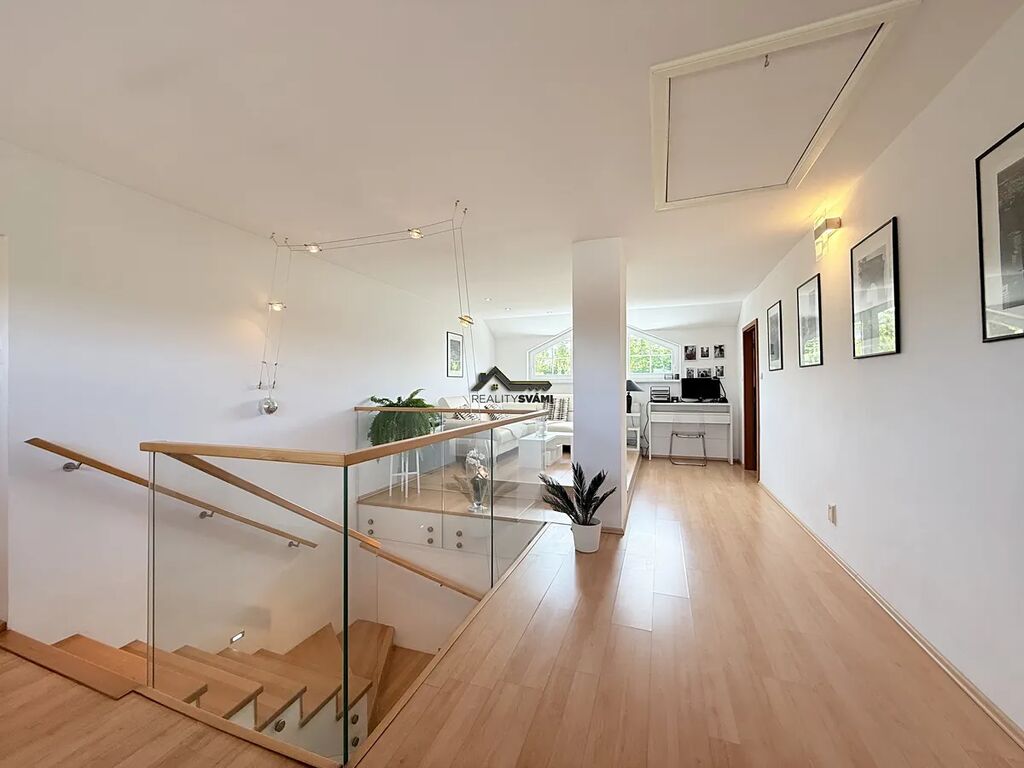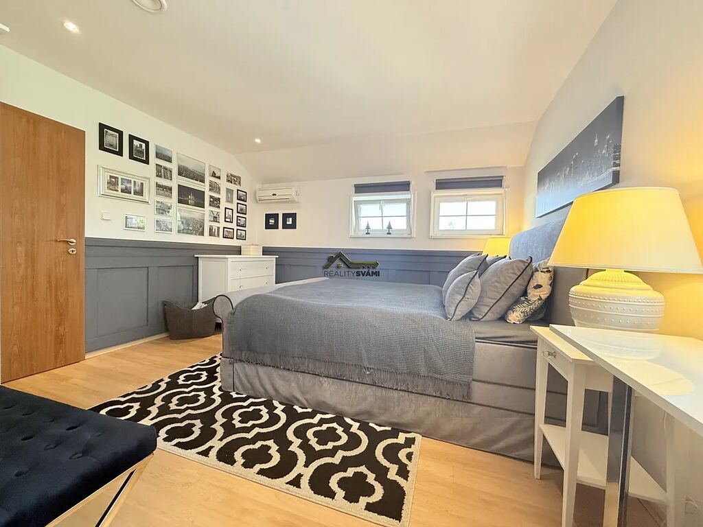 •	Patro: hlavní ložnice s vlastní šatnou, moderní koupelna s vestavěným ozvučením, dvě další ložnice se společným balkonem a prostorná galerie s posezením.