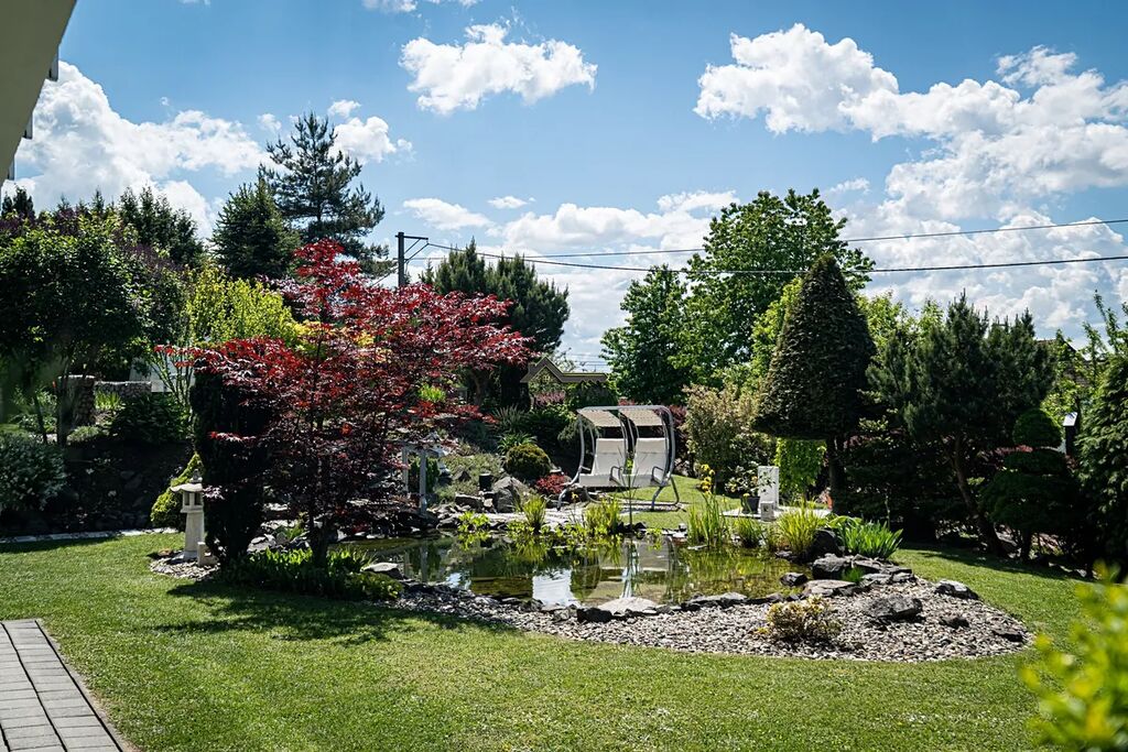 Zahrada je pečlivě navržená, s důrazem na estetiku i funkčnost – upravené okrasné dřeviny, promyšlené rozmístění záhonů a harmonické propojení s okolní přírodou vytvářejí dokonalé místo pro odpočinek.