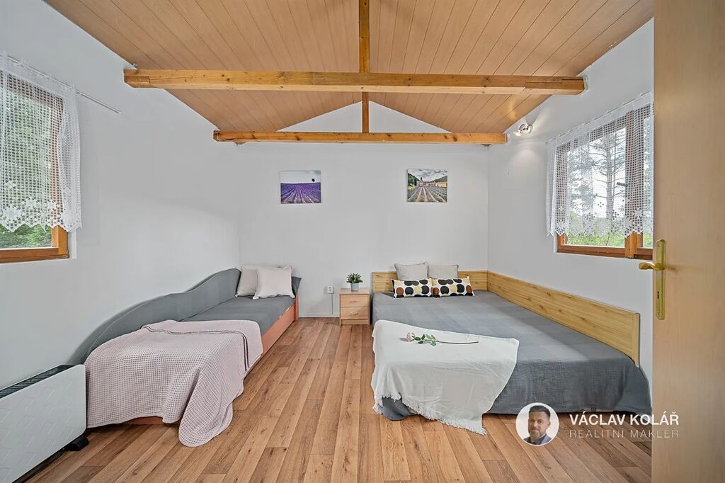 Dřevěná stavba nabízí dvě ložnice, kuchyni s jídelnou a koupelnu se sprchovým koutem a toaletou. Stojí na oploceném pozemku o velikosti 291 m², kde se nachází ještě pergola se zděným krbem, bazén s čističkou, prolézačka pro děti a sklad na dřevo nebo sportovní vybavení.