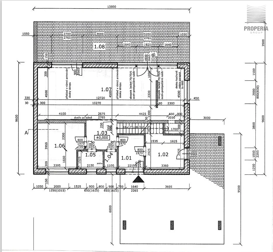 I.NP – zádveří 6,5 m2, šatna 11,4 m2, hala 6,8 m2, WC 1,7 m2, prádelna 3,2 m2, pracovna 15 m2 a obývací pokoj s kuchyňským koutem 59 m2 se vstupem na terasu 46 m2