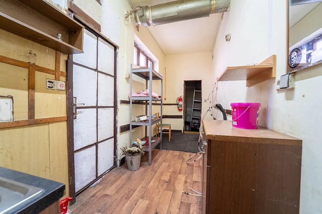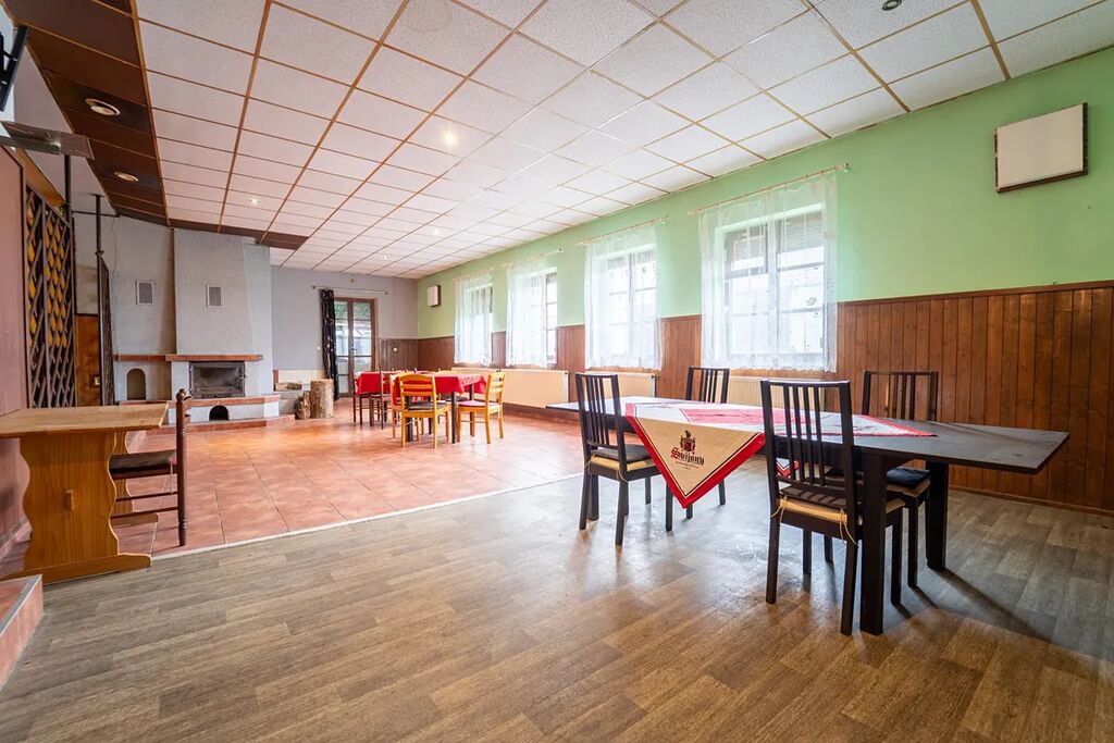 V přízemí fungovala velká pivnice dva prostorné sály, bar, zázemí, toalety pro pány i dámy a technická místnost, to vše o rozloze cca 185 m2. Tyto prostory však nemusí zůstat jen pivnicí - díky své velikosti a dispozici je lze předělat na jakýkoliv jiný komerční prostor, nebo je přetvořit na úplně jiné využití podle potřeb nového majitele. Terasu pro hosty lze zachovat nebo využít k parkování na vlastním pozemku. Na dvoře domu najdete prostorný dřevník s přímým vstupem do zadní části restaurace.