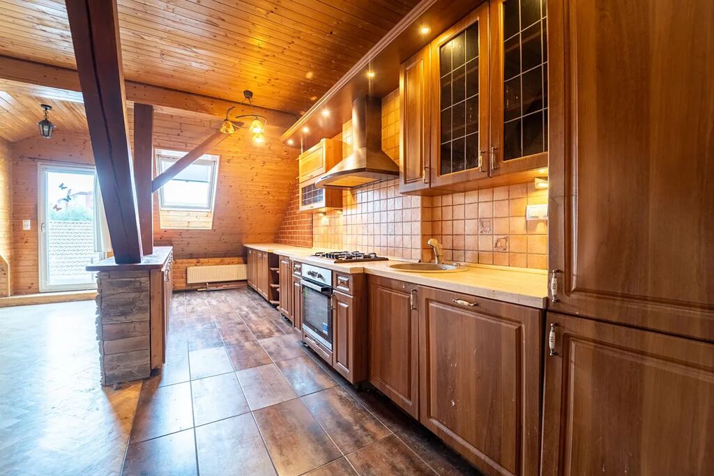 Ve 2. NP je byt s užitnou plochou 115 m2. Byt je aktuálně řešen jako 2+kk s velkou terasou, dalších 82 m2. Světlý, prostorný a s jasnou odděleností od podnikání v přízemí. Byt je celý obložen dřevem - díky tomu působí teple, útulně a má zajímavou atmosféru.