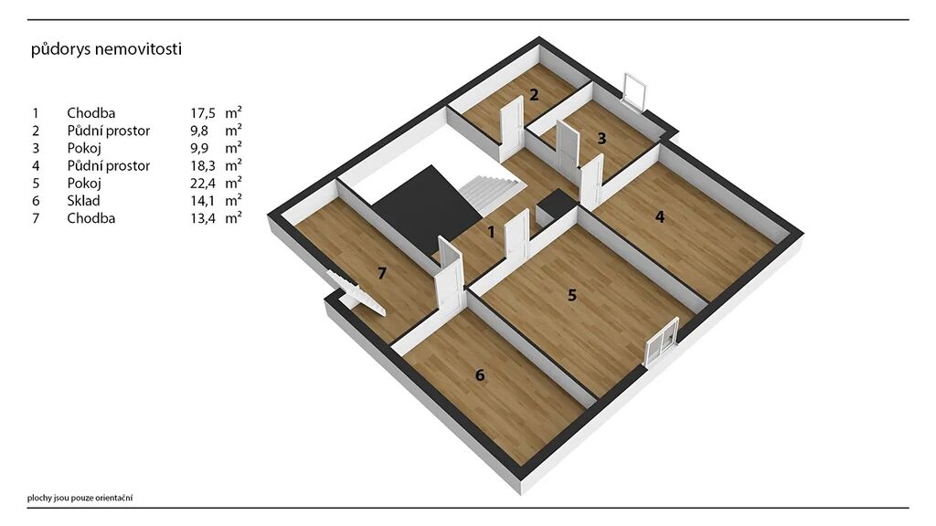 Ve třetím podlaží na vás čeká několik dalších místností, nabízejících prostor k přestavbě na útulné pokoje pro hosty či kanceláře. Součástí tohoto patra je také půdní prostor, který otevírá další dimenzi využití. Půdu lze přestavět na další ubytovací prostory s jedinečnou podkrovní atmosférou a maximalizovat tak celkovou kapacitu.