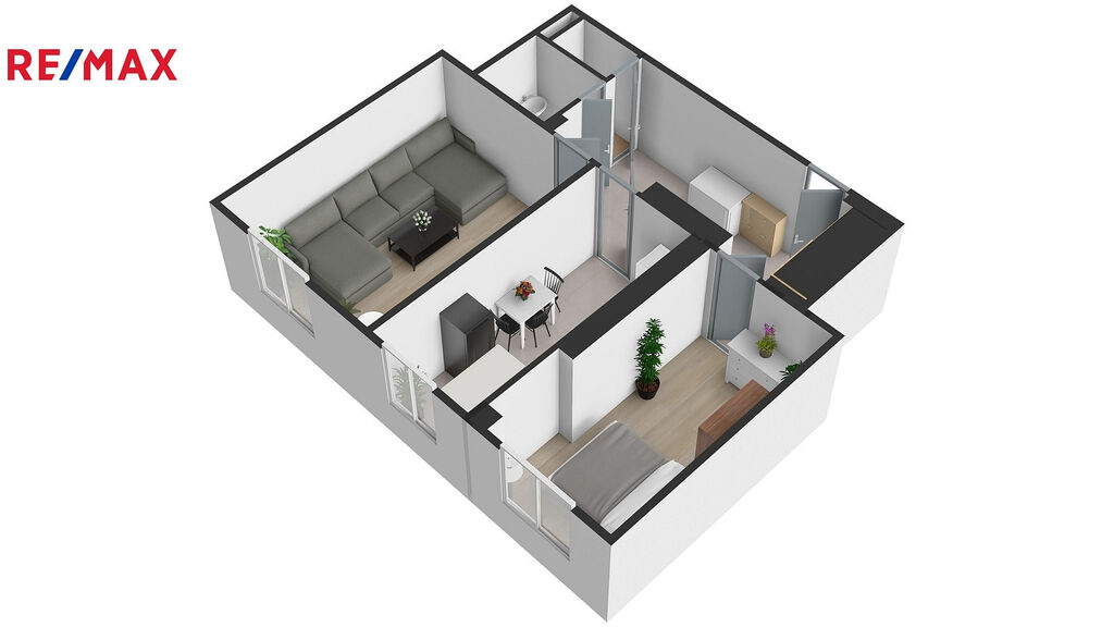 Byt sestává ze dvou neprůchozích pokojů, které poskytují dostatek soukromí, kuchyně, chodby, koupelny s vanou a WC.