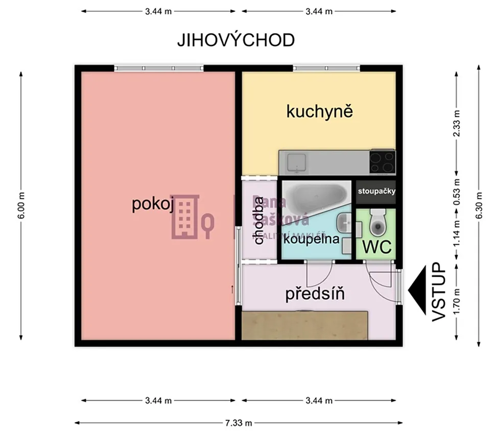 Dispozice 1+1 nabízí předsíň, chodbu, obývací pokoj, kuchyni, koupelnu s vanou a samostatnou toaletu.