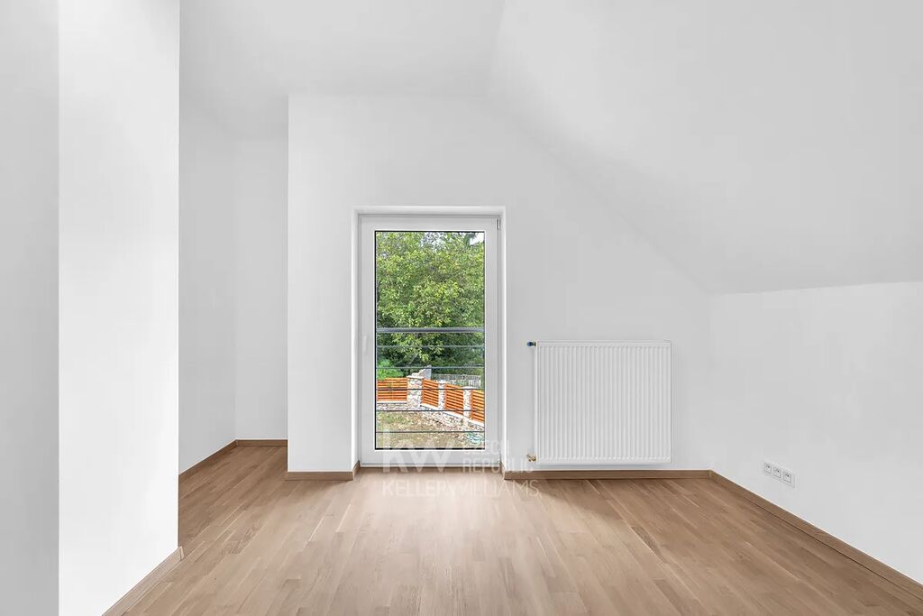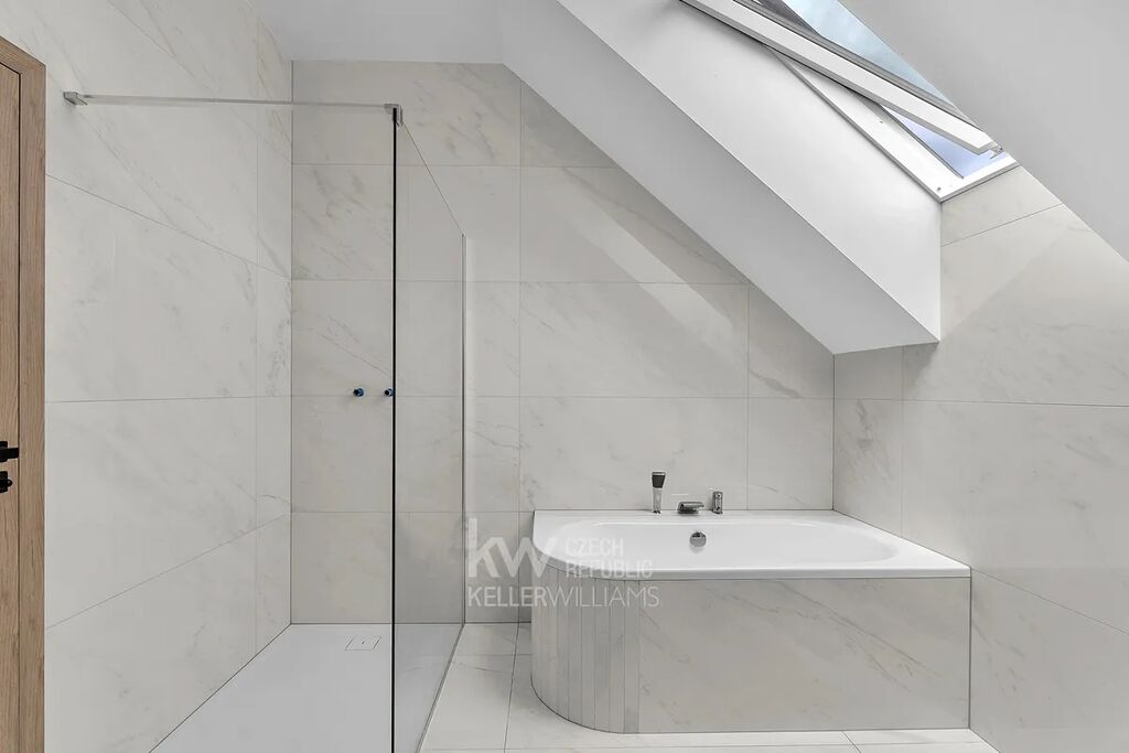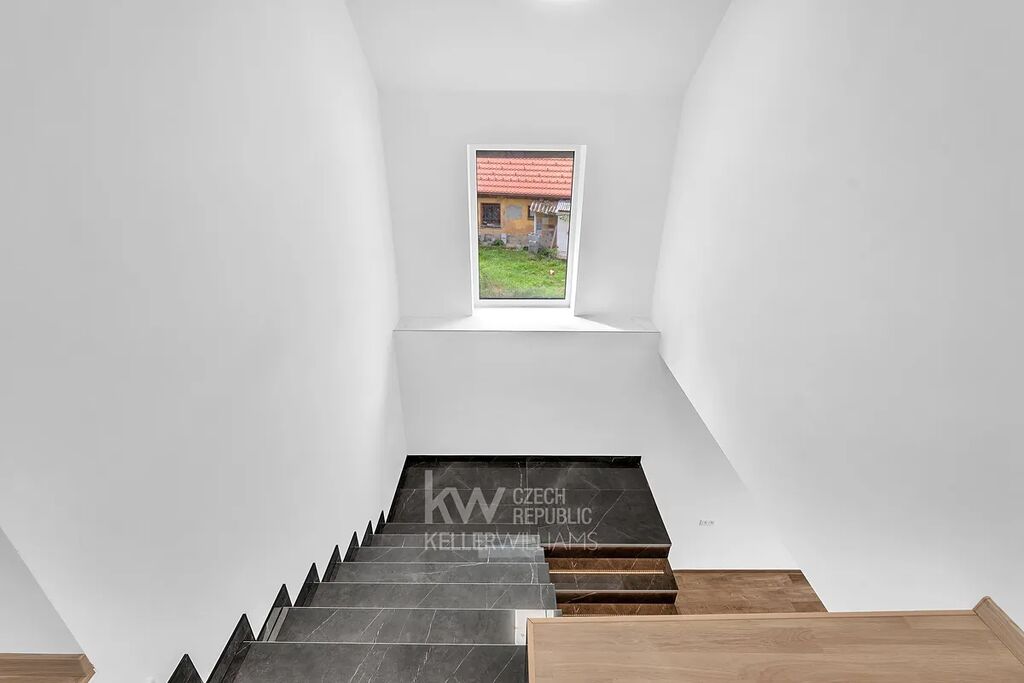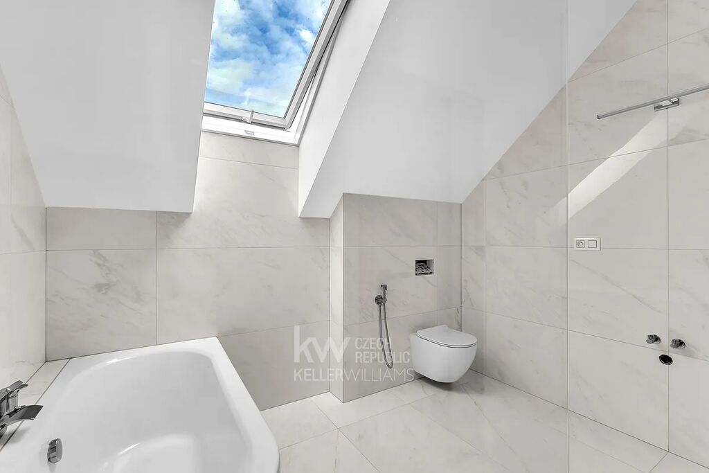 Do druhého patra vedou elegantní schody s Italským mramorovým obkladem, které jsou vybaveny automatickým senzorem osvětlení pro maximální komfort a bezpečnost. V horním patře se nacházejí čtyři samostatné, vzdušné pokoje s dostatkem přirozeného světla. Dva z nich mají velkorysou plochu 21,5 m² a další dva mají rozměry 15,9 m² a 17,8 m². Na patře se nachází také druhá koupelna, vybavená sprchovým koutem, vanou, WC a bidetovou sprchou, což poskytuje dostatek komfortu pro celou rodinu.