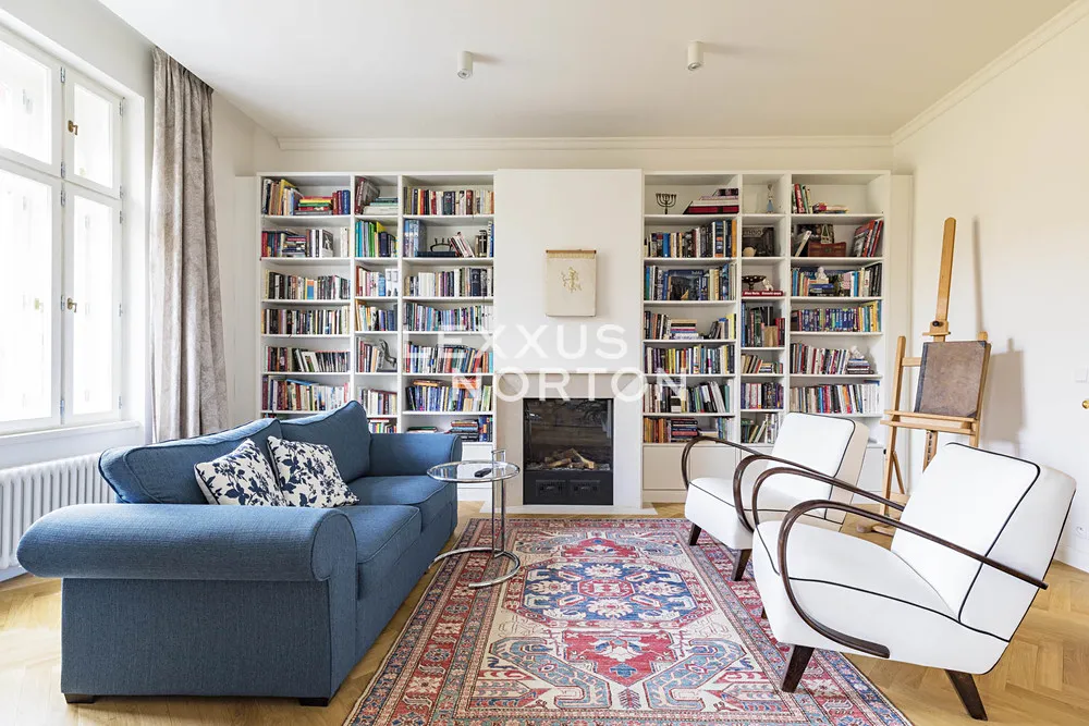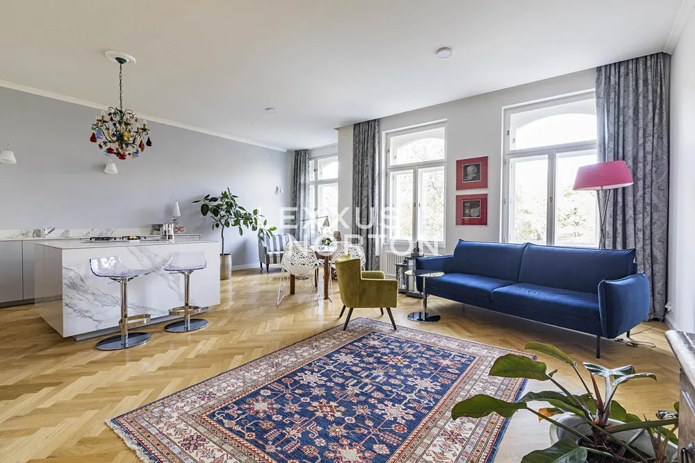 Tento rekonstruovaný, luxusně zařízený byt 3+kk k pronájmu nabízí k užívání vstupní chodbu, prostorný obývací pokoj s plně vybaveným kuchyňským koutem (sporák, trouba, lednice, mrazák, myčka nádobí) a jídelním prostorem, ložnici s vlastní koupelnou v kvalitním mramorovém provedení (vana, sprchový kout), pracovnu s krbem, šatnu, další koupelnu a komoru. Z bytu je krásný výhled na Riegrovy sady. K dispozici je zde také sklep za dodatečný poplatek. Možnost pronájmu parkovacích stání za závorou (cca 100 m od domu) za extra měsíční poplatek 2 500 Kč/stání + DPH.
