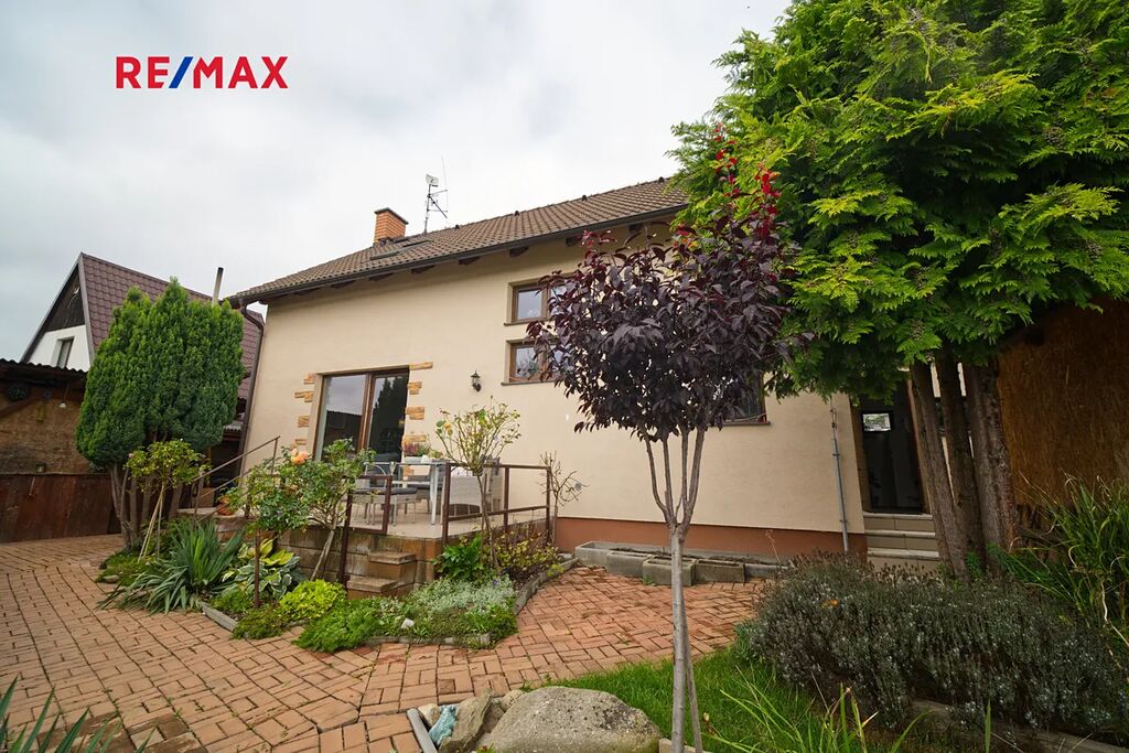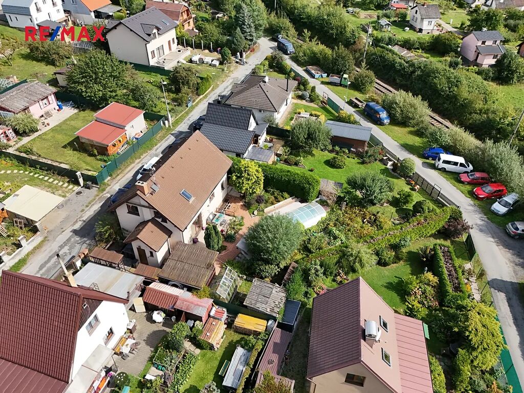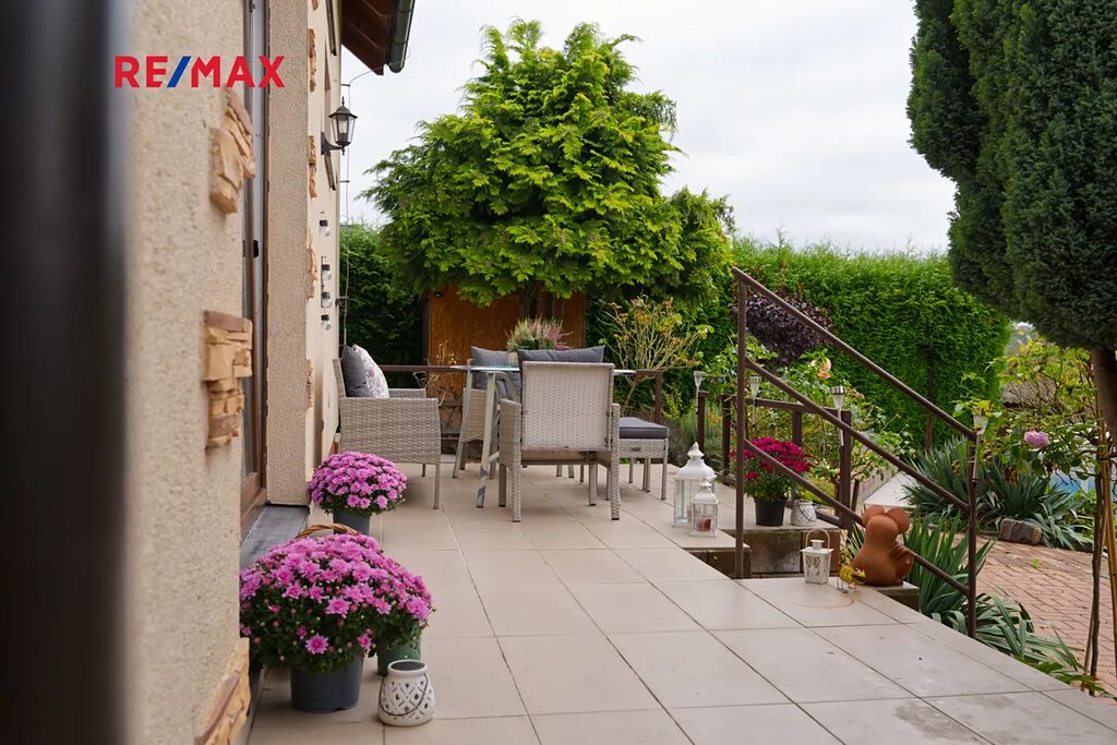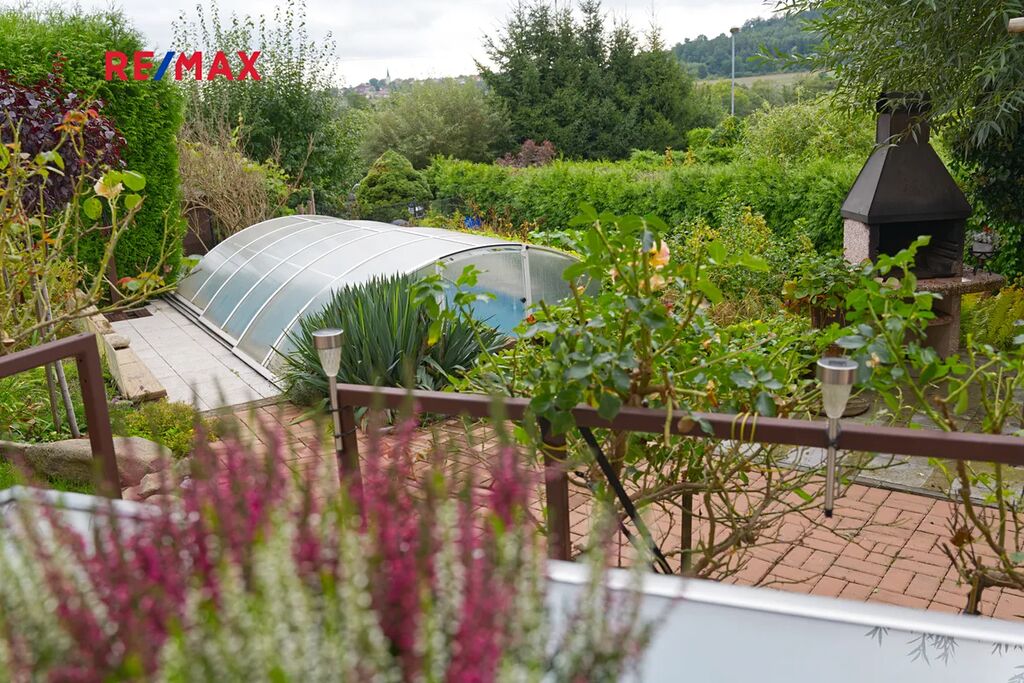 Součástí pozemku je zahrada o výměře 360 m² s bazénem 5 × 3 m s protiproudem, skleníkem a dvěma přístřešky vhodnými na nářadí či zahradní techniku.