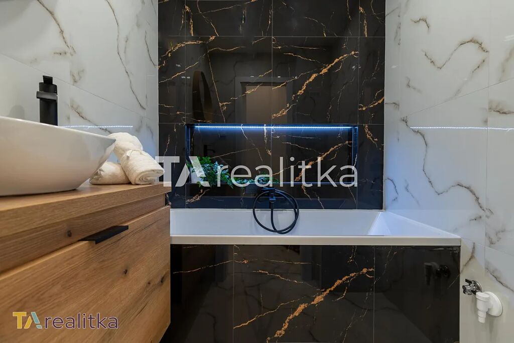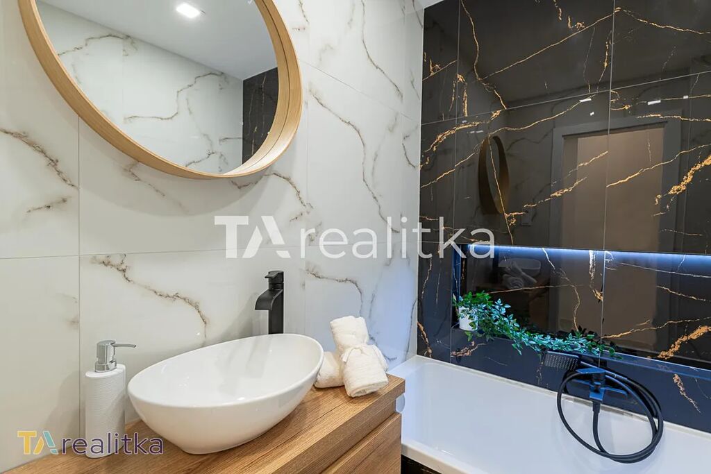 Nová koupelna s vanou, umyvadlem se skříňkou a zrcadlem