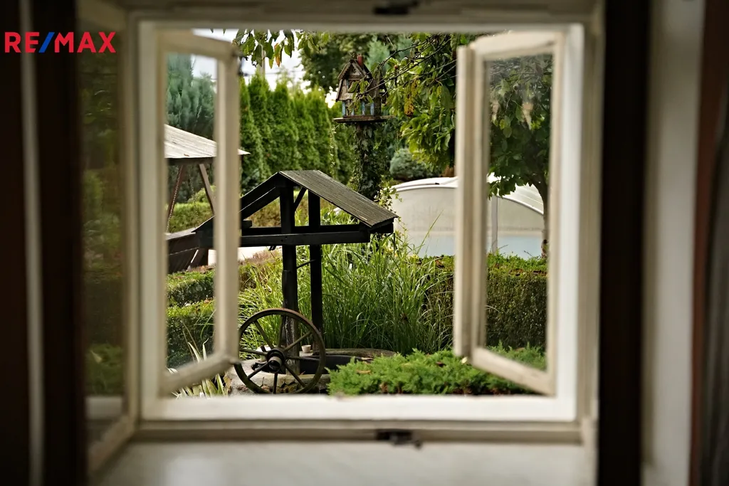 Celý den osluněná zahrada o rozloze 683 m² vás pohltí svou atmosférou. Rostou zde ovocné i okrasné stromy a keře a je lemována z velké části živým plotem. Díky tomu má dům zajištěno soukromí. Můžete si užívat venkovní krytý bazén nebo se nechat houpat v masivní houpačce. Zahradní jezírko a skalka, pečlivě osázená rostlinami, tvoří krásné zátiší. K zalévání je využívána dešťová voda sbíraná do dvou velkých barelů. Zahrada je také vybavena praktickými přístřešky na nářadí a udírnou. Na pozemku, vně zahrady, je vyhrazeno stání pro jedno auto.