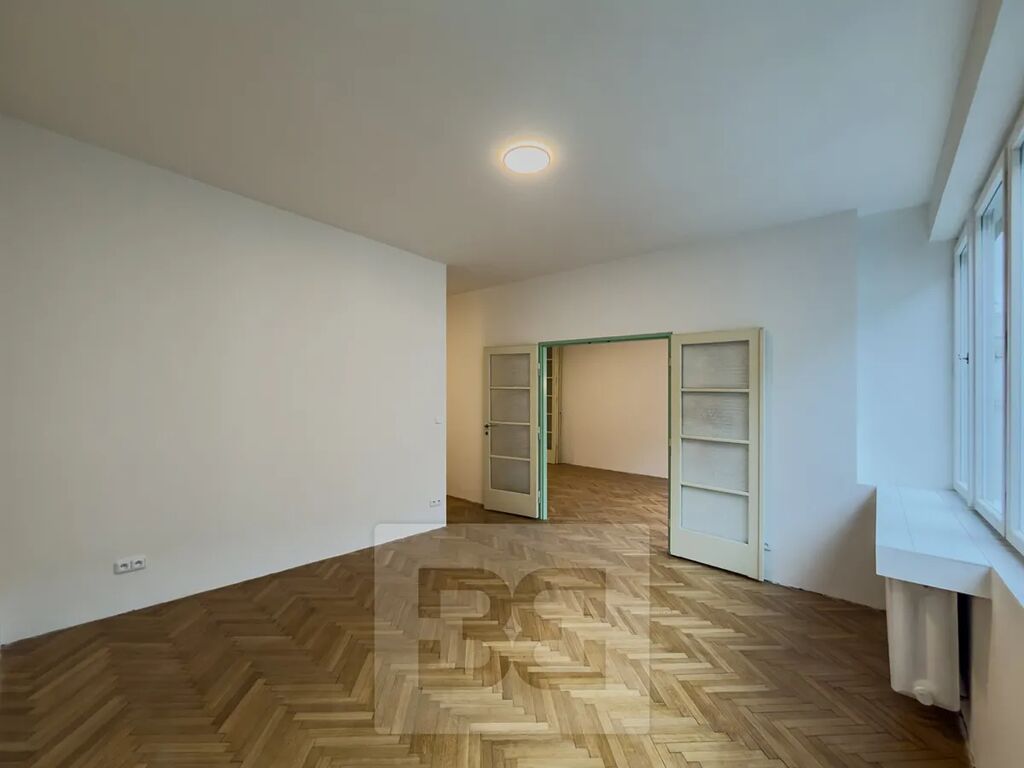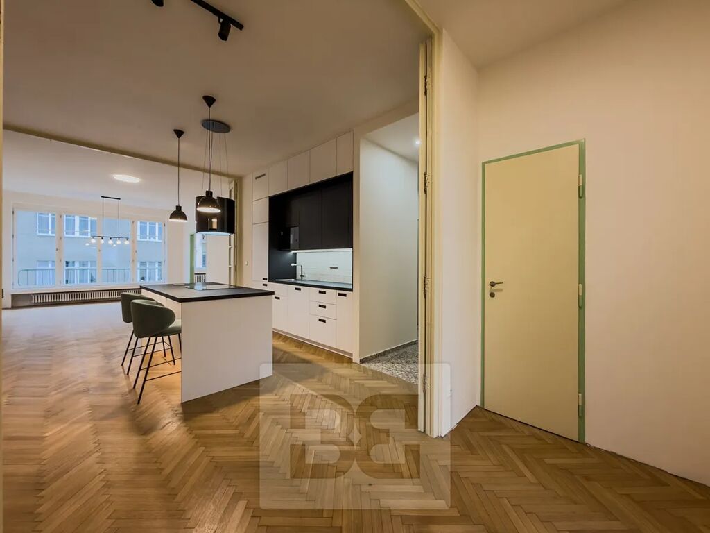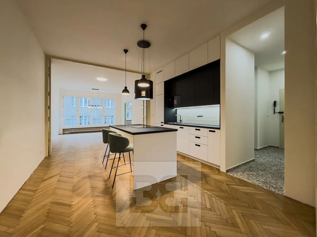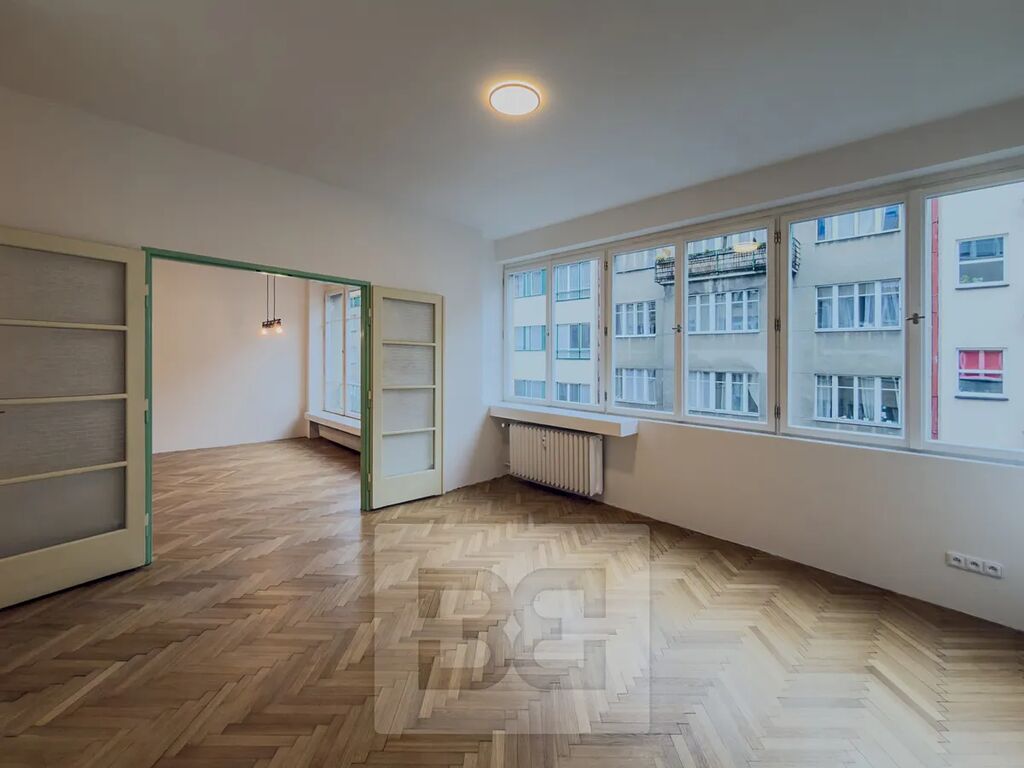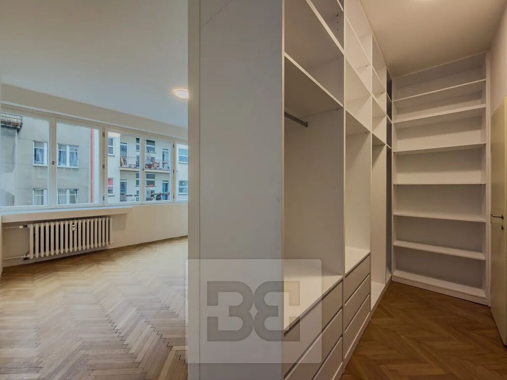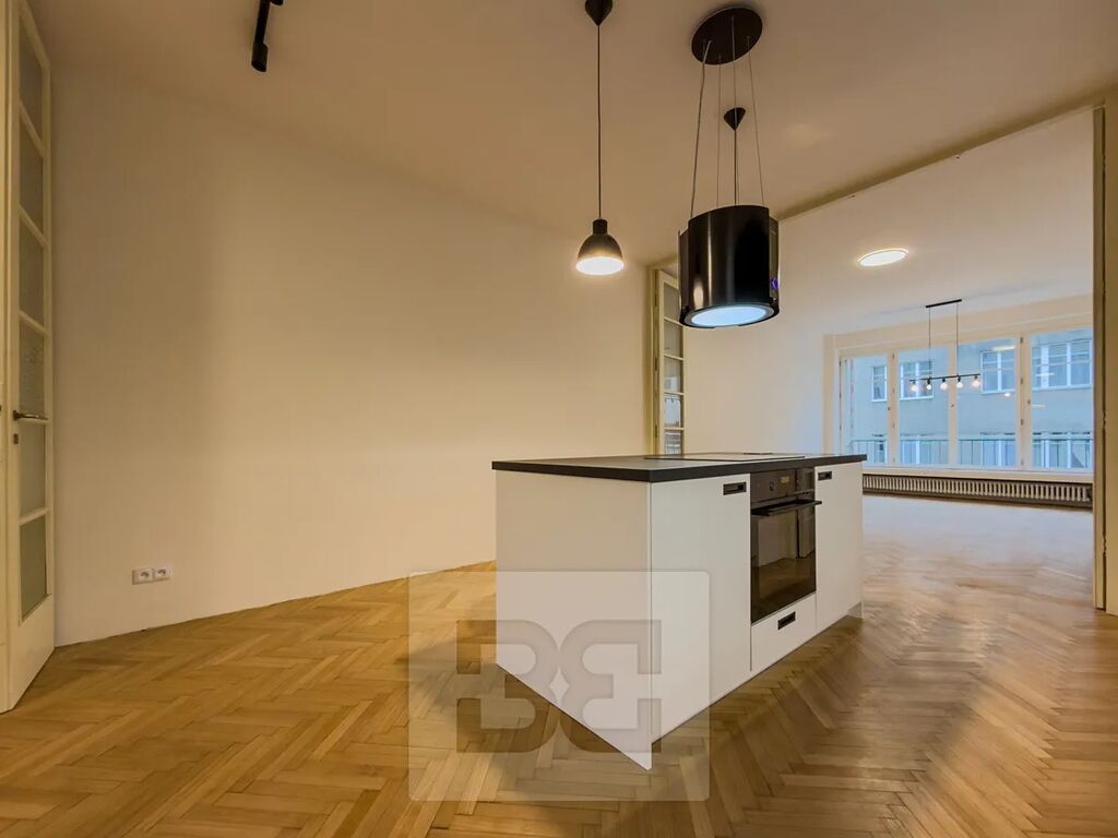 Nabízíme k dlouhodobému pronájmu jedinečný byt 4+kk o rozloze 118 m2, který se nachází ve třetím patře funkcionalistického domu s výtahem, v ulici Vinařská u Strossmayerova náměstí. Byt prošel kompletní a náročnou rekonstrukcí: renovace podlah, nové koupelny, nová kuchyně a vestavný nábytek, nová okna. Dominantou bytu je prostorný obývací pokoj s kompletně vybavenou kuchyní, který se dá rozdělit původními skládacími dveřmi, představujícími velmi praktický prvek pro pružné členění prostoru. Krásná okna na celou šířku stěny zajišťují průnik velkého množství denního světla. Z haly se dostanete do hlavní ložnice, která je vybavena velkou šatnou a oddělenou koupelnou s WC a sprchovým koutem. Na druhém konci obývacího pokoje najdeme druhou ložnici s oknem do vnitrobloku a velkou vestavnou skříní. Z předsíně je vstup do menšího pokoje s balkonem, který může sloužit jako dětský pokoj nebo pracovna. Tento pokoj je též vybaven šatní skříní. Dále z předsíně vstoupíte do koupelny s vanou a na samostatné WC.