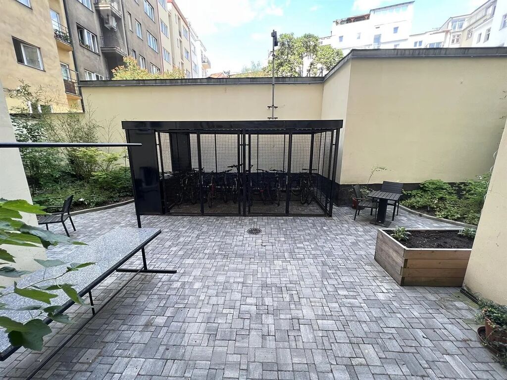 Výhled je jak do vnitrobloku, tak i na hlavní ulici. Jedná se o velmi klidnou ulici a v bytě panuje ticho a klid. Obyvatelům domu je k dispozici bezpečný prostor pro parkování kol umístěný na dvoře. K dispozici je sklep v suterénu budovy. V bytě se nacházejí dvě komory pro uskladnění potravin a dalších věcí.