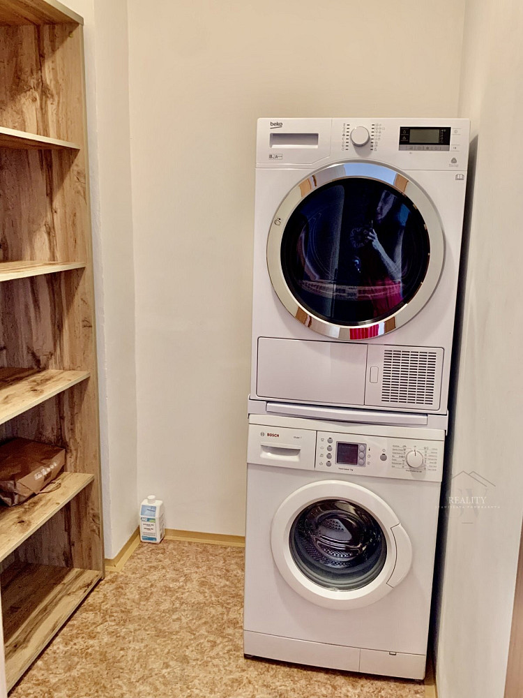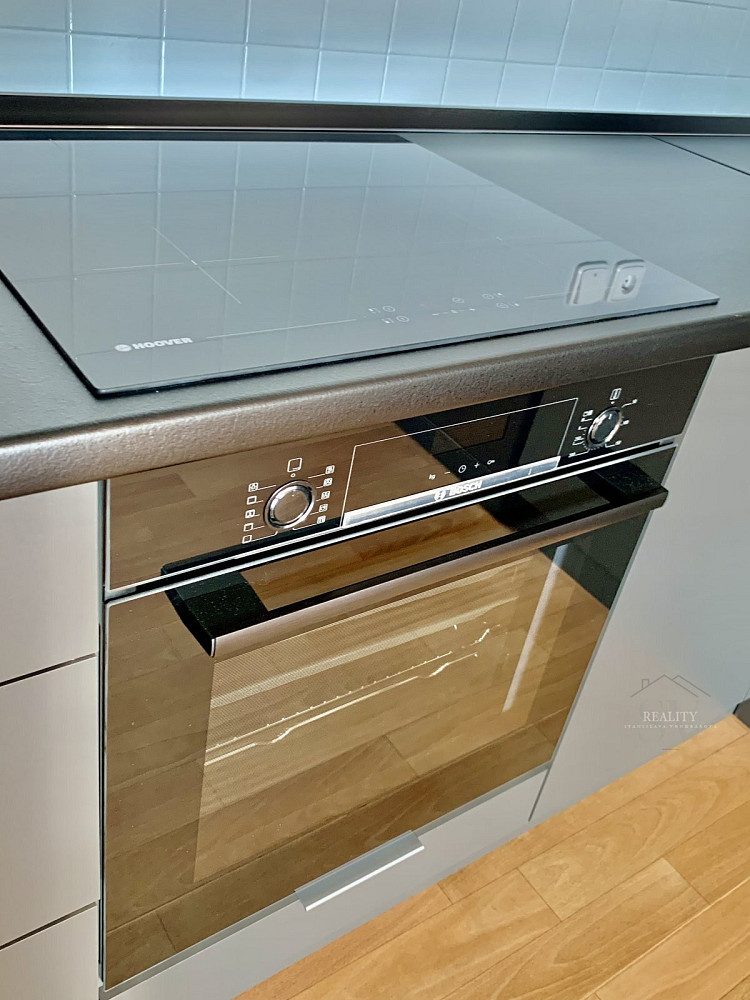 vstupní chodba s praktickou komorou a regály, moderní kuchyňská linka na míru vybavená vestavnými spotřebiči Bosch (trouba, sklokeramická varná deska, digestoř, myčka) a volně stojící lednicí, obývací část s veškerým vybavením dle fotografií (sedačka, koberec, stolek, komoda, jídelní stůl se židlemi, osvětlení, obrazy), ložnice s manželskou postelí a vstupem na balkon orientovaný na jihozápad, koupelna se sprchovým koutem a WC, pračka se sušičkou součástí vybavení.