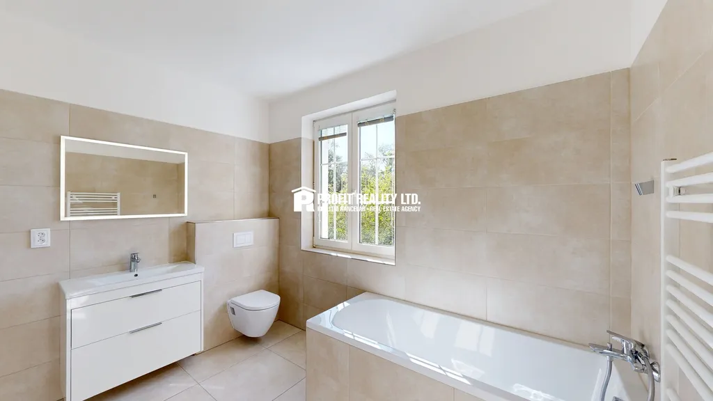 Velkou přidanou hodnotou je vlastní zahrada, terasa a garáž – tedy zázemí, které u běžných bytů v Praze nenajdete.