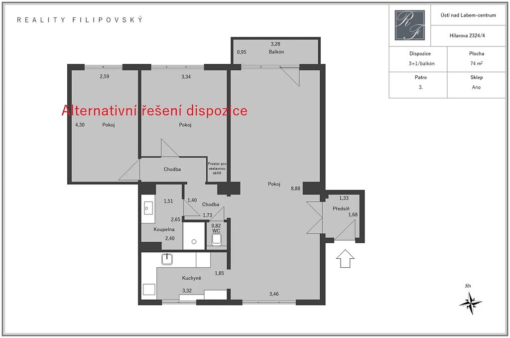 Podstatná část bytu byla v minulosti zrekonstruována (kuchyně, koupelna, toaleta). Na rekonstrukci lze velmi dobře navázat a při té příležitosti můžete drobnou úpravou dispozice získat i neprůchozí prostřední pokoj viz. alternativní řešení dispozice ve fotogalerii. V případě využití plného potenciálu této jednotky si zde umím představit i realizaci dispozice 4+1. Velice se mi líbí balkón i výhled ze všech oken. K bytu také náleží prostorný zděný sklep, který by mohl být i malou dílnou. Dále je k dispozici velká společná místnost užívaná rovným dílem všemi vlastníky bytů.
