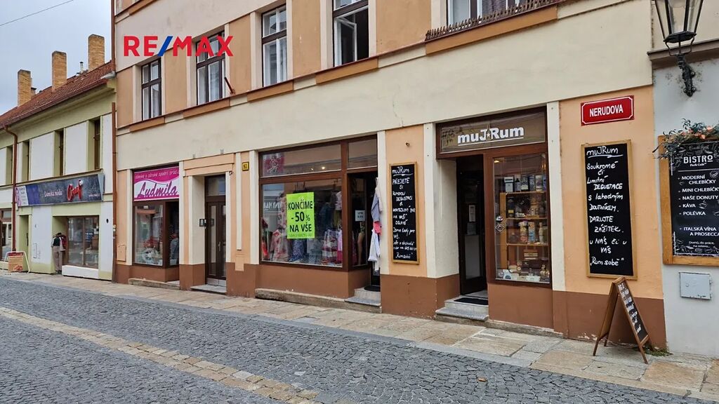Nabízíme k pronájmu obchodní prostory v centru města Písek na pěší zóně v Nerudově ulici č. 163 o výměře 76 m2. 76.15 m2. K dispozici je samostatné uzamykatelné zázemí (sklad, kancelář), vlastní WC, zkušební kabinky, prostorná výloha do pěší zóny, elektrické přímotopy. Prostory sloužily dlouhodobě jako prodejna textilu, je možné ale jejich účel změnit.