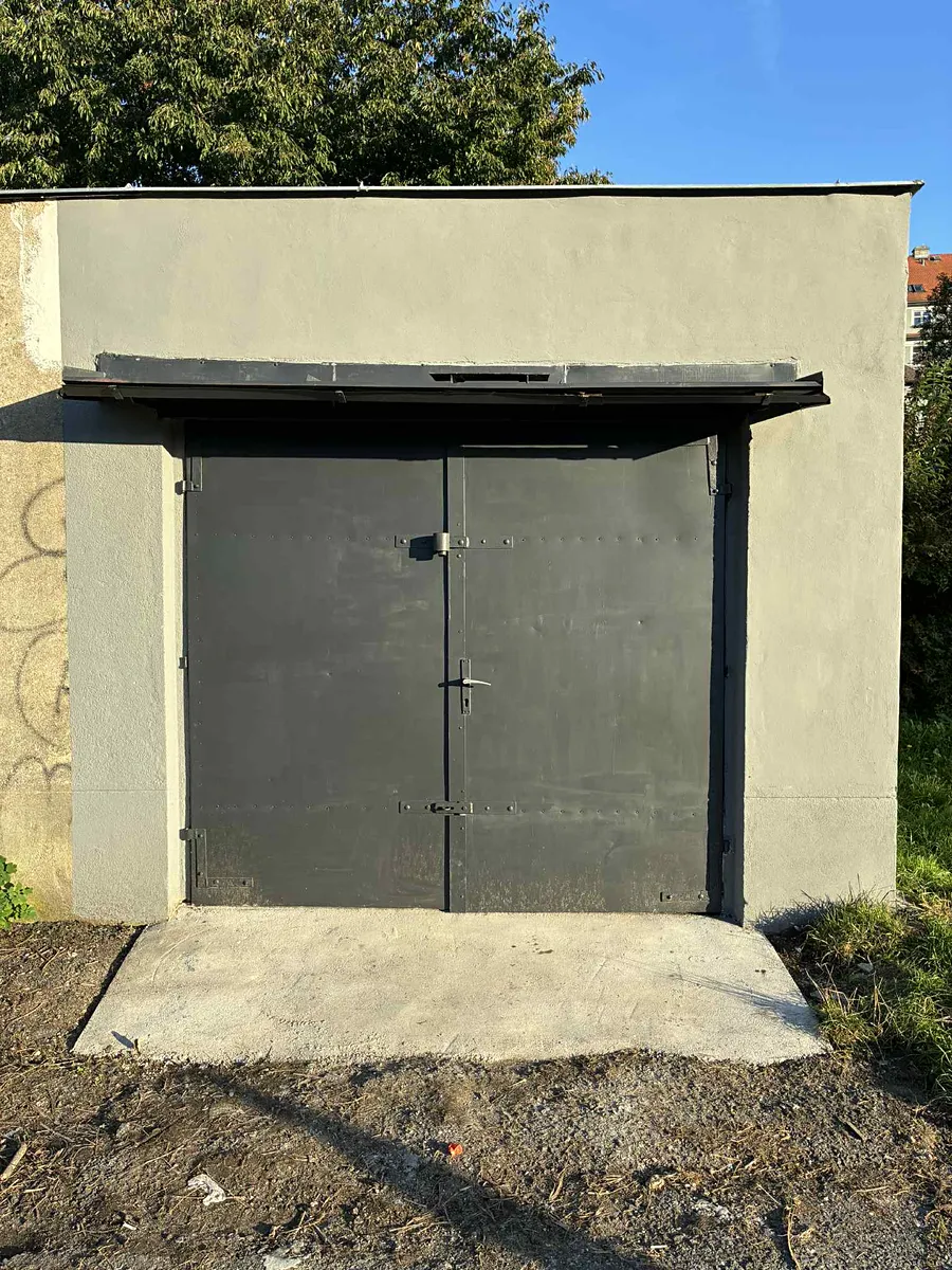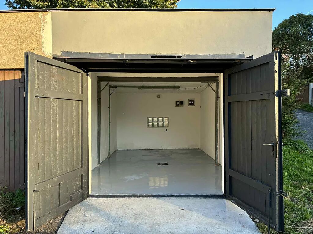 Garáž je po částečné revitalizaci (nově natřená vrata a vnitřní omítky, dále nová podlaha, elektřina, venkovní fasáda garáže, vybetonovaný příjezd ke garáži a částečně opravená střecha).