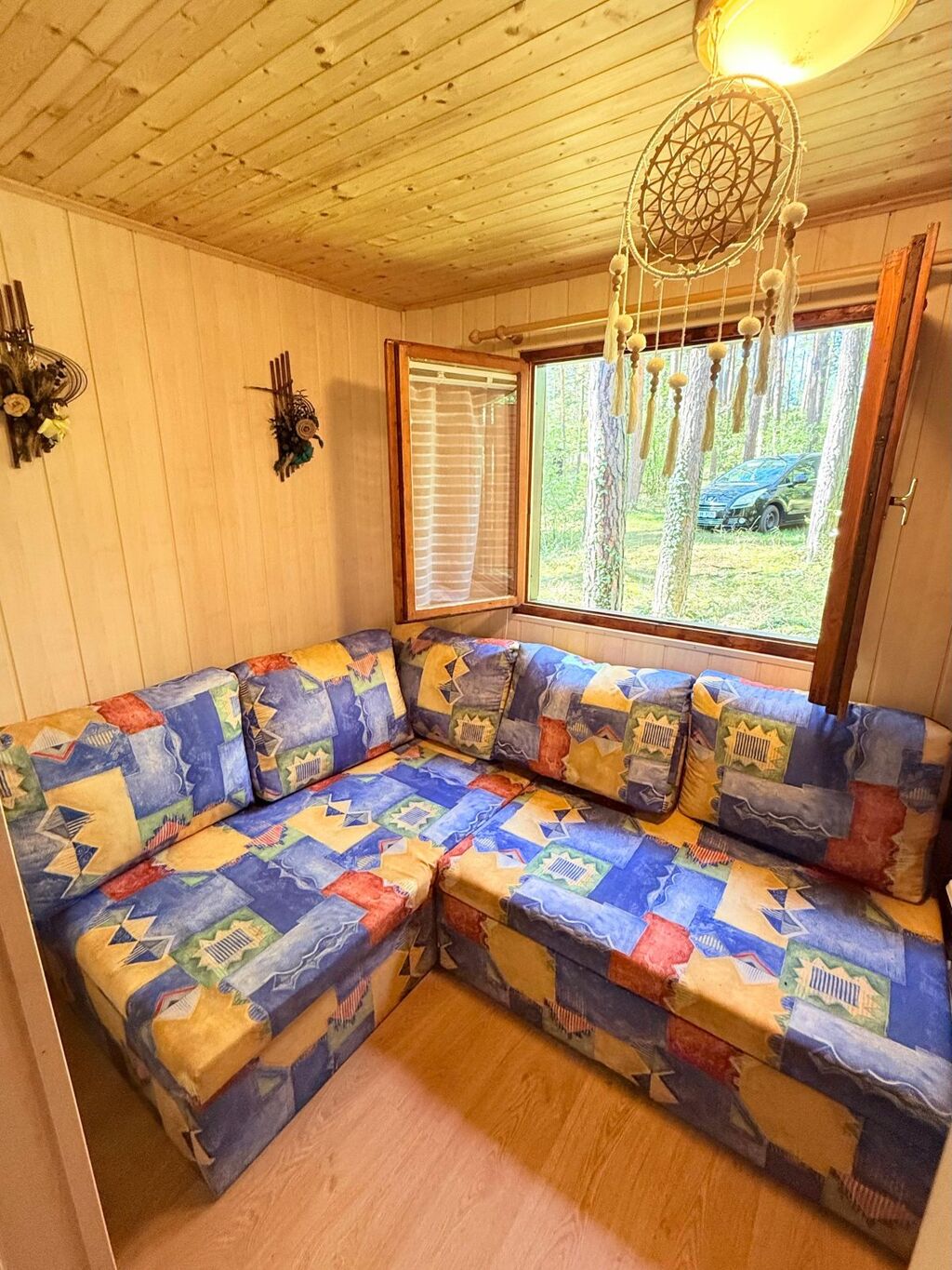 suterén: sklep, technická místnost se sprchou a chemickým WC (s možností vybudování septiku), přízemí: zastřešená venkovní terasa ideální k posezení, předsíň, kuchyně spojená s obývací částí a ložnice, podkroví - útulný spací prostor vhodný pro děti nebo hosty.