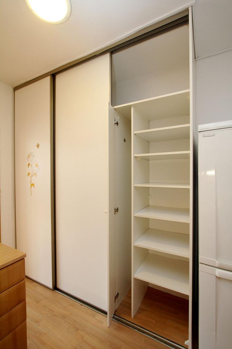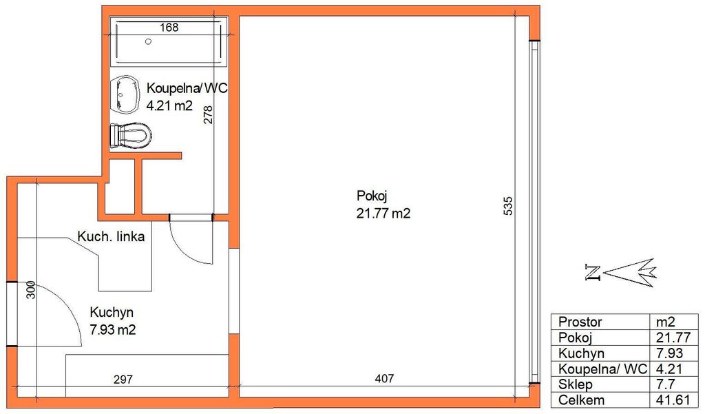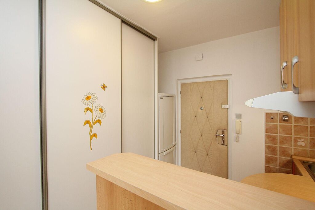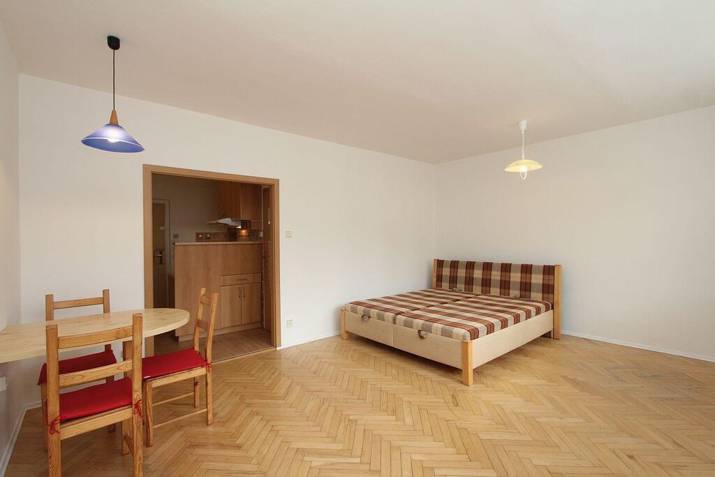 Jedná se o pronájem bytu o dispozici 1+kk, 37 m2, s tím, že kuchyňská linka je umístěna v předsíní, díky tomu je hlavní obytná místnost prostorově volná k plnému využití.