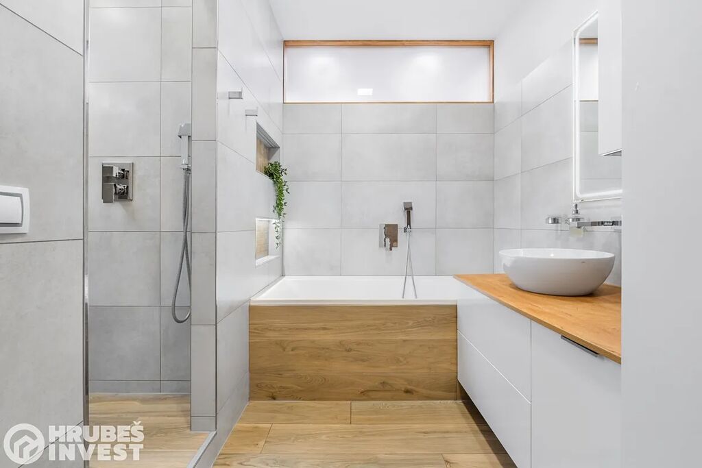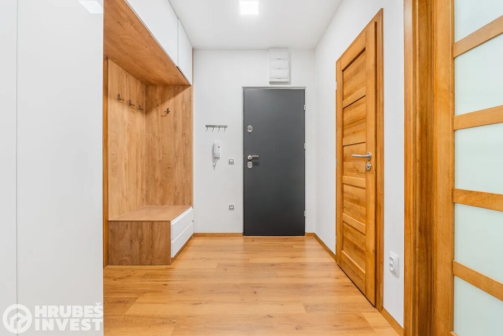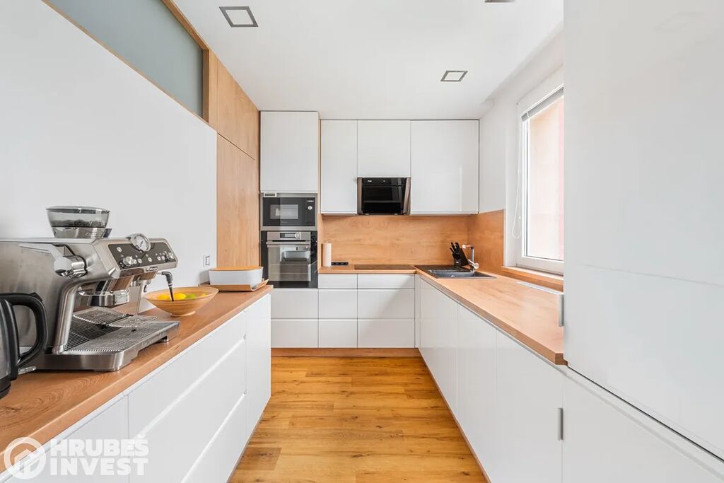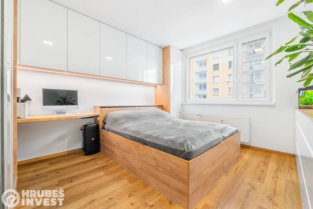 Byt o dispozici 3+kk se nachází v 5. nadzemním podlaží panelového domu s výtahem, který prošel kompletní rekonstrukcí v roce 2019. Tady je opravdu vše promyšlené do detailu – od vestavěných skříní, skryté komory až po elegantní koupelnu, kde najdete vanu i sprchový kout.