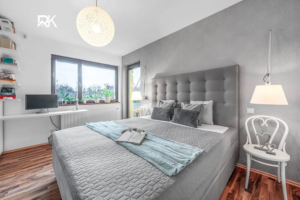 Interiér bytu je navržen s důrazem na moderní design a funkčnost. Prostorný obývací pokoj s kuchyňským koutem je vybaven kvalitními vestavěnými spotřebiči a nabízí dostatek místa pro rodinné setkávání. Dvě samostatné ložnice poskytují komfortní zázemí pro rodinu či pracovnu. Koupelna je vybavena vanou, toaleta je oddělená. V bytě jsou instalovány radiátory napojené na centrální plynovou kotelnu, což zajišťuje efektivní vytápění.