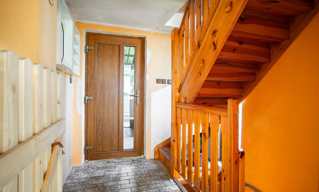 v 1. NP - hlavní vchod - se nachází vstupní chodba se schodištěm, kdy dále pokračujeme do prostorné kuchyně a obývacího pokoje s krbovými kamny a přímým vstupem pod krytou pergolu se zahradním posezením. Ze vstupní chodby se schodišti dostaneme do již zmíněného přízemí, nebo do podkroví, kde se nachází otevřený prostor se vstupy do dvou ložnic se společným balkónem.