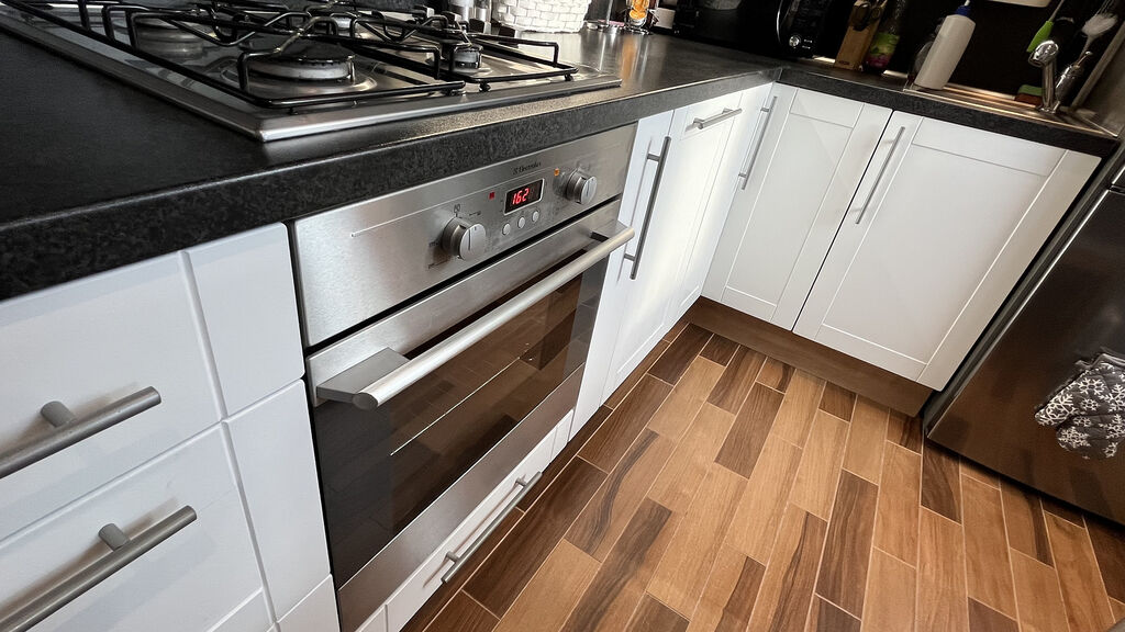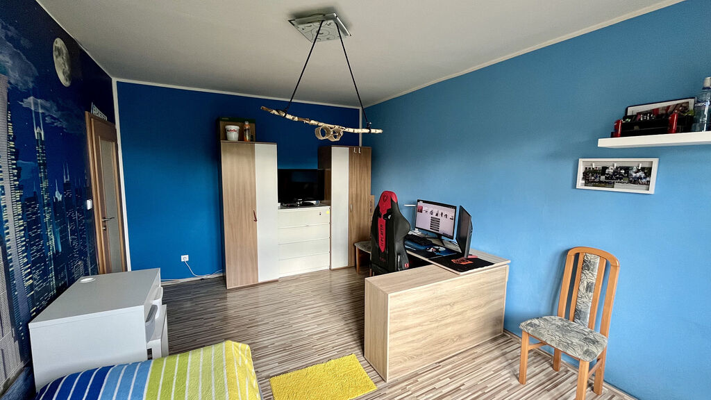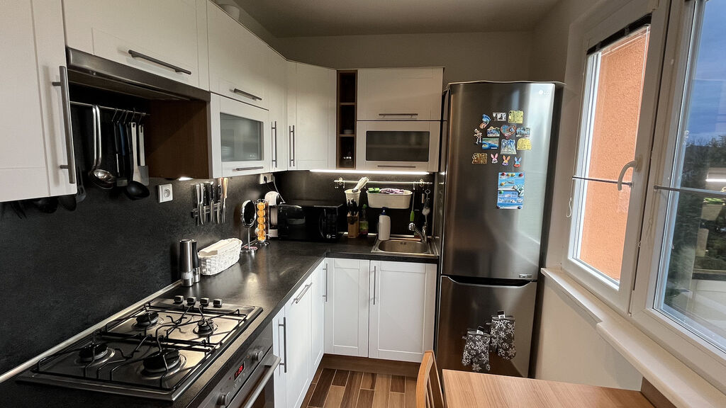 Kuchyňská linka je vybavena plynovým sporákem, elektrickou troubou a myčkou, což usnadňuje každodenní vaření a úklid. Na chodbě se nachází vestavná skříň, která poskytuje dostatek úložného prostoru. Dlažba v kuchyni a chodbě je praktická a snadno udržovatelná, zatímco v pokojích je plovoucí podlaha, která dodává bytu příjemný vzhled. Samostatné WC zajišťuje pohodlí a soukromí. V koupelně naleznete sprchový kout, což umožnilo umístit i pračku se sušičkou.
