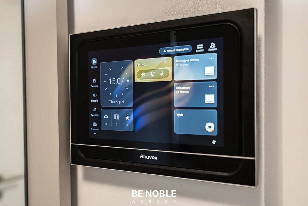 V bytě jsou dřevěné podlahy, rekuperace, trojskla, venkovní žaluzie a systém chytré domácnosti s dálkovým ovládáním topení, světel a žaluzií.