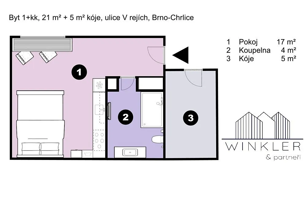 K dlouhodobému pronájmu nabízíme plně zařízený byt o dispozici 1+kk, na ulici V rejích, v klidné lokalitě, malý kousek od centra, v Brně-Chrlicích.