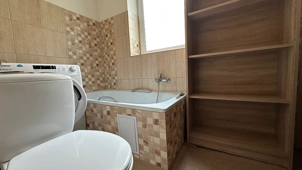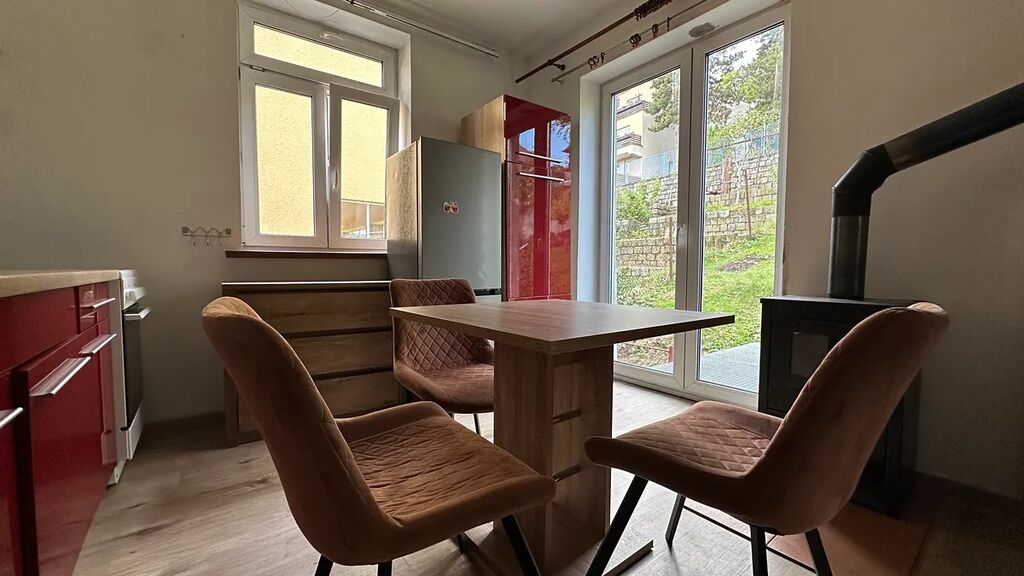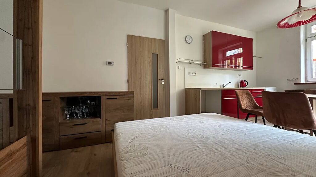 Pronájem bytu 1+kk v centru Luhačovic s vlastní zahradou s přímým přístupem z pokoje. Nachází se v 1. patře prvorepublikové vily. Byt sestává ze vstupní choby, pokoje s kuchyňskou linkou, sporákem, troubou, lednicí, dále je k dispozici stůl s židlemi, manželská postel, skříň, komoda, koupelna vanou a WC. Vytápění infrapanely + krbová kamna. Výměra 30 m2, slunná zahrada s ovocnými stromy o výměře 212 m2. Výborná poloha! K nastěhování od 15. 10. 2025.