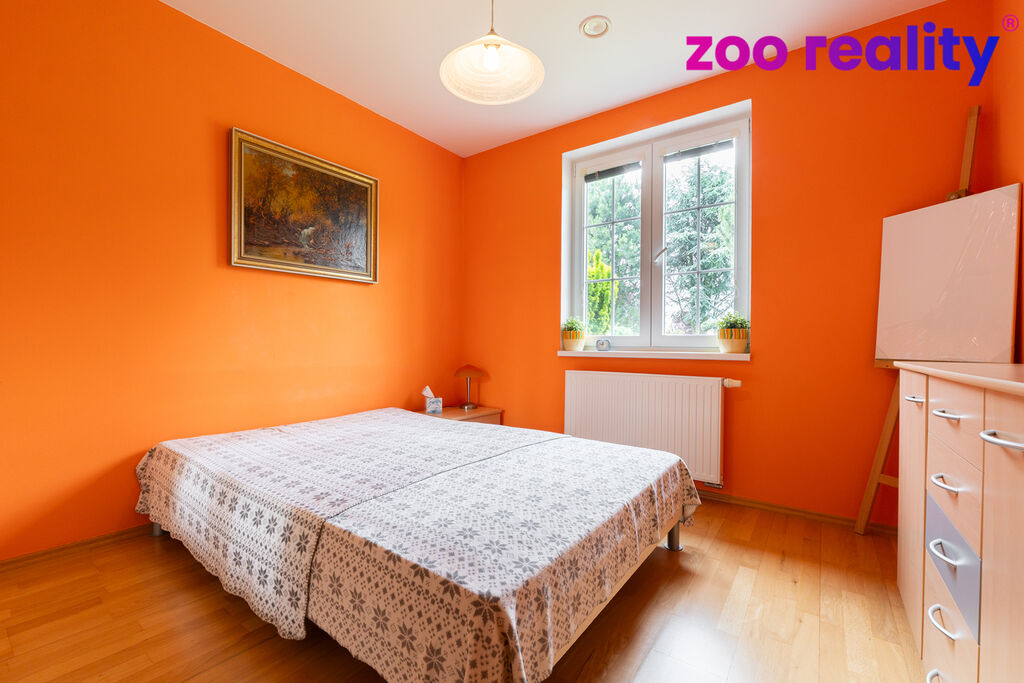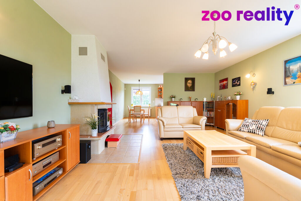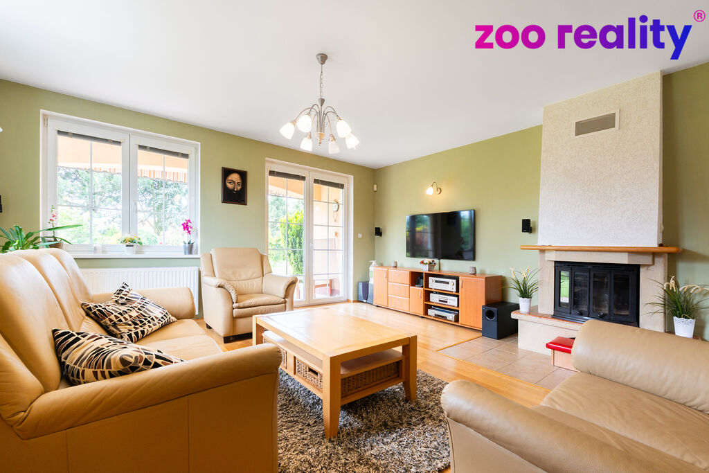 Dům má velmi dobře promyšlenou dispozici 4+kk. Obytný prostor tvoří světlý a vzdušný obývací pokoj s krbem, navazující jídelní kout a kuchyň s oknem do zahrady. Z obývací části je přímý vstup na krytou terasu s výhledem do zeleně. Dále jsou k dispozici dvě ložnice, pracovna, koupelna s vanou a sprchovým koutem a samostatná toaleta. Vstupní hala je vybavena vestavěnými skříněmi. Součástí domu je rovněž garáž a menší dílna.