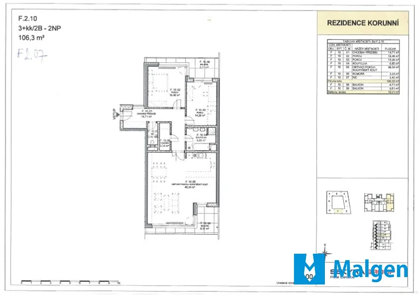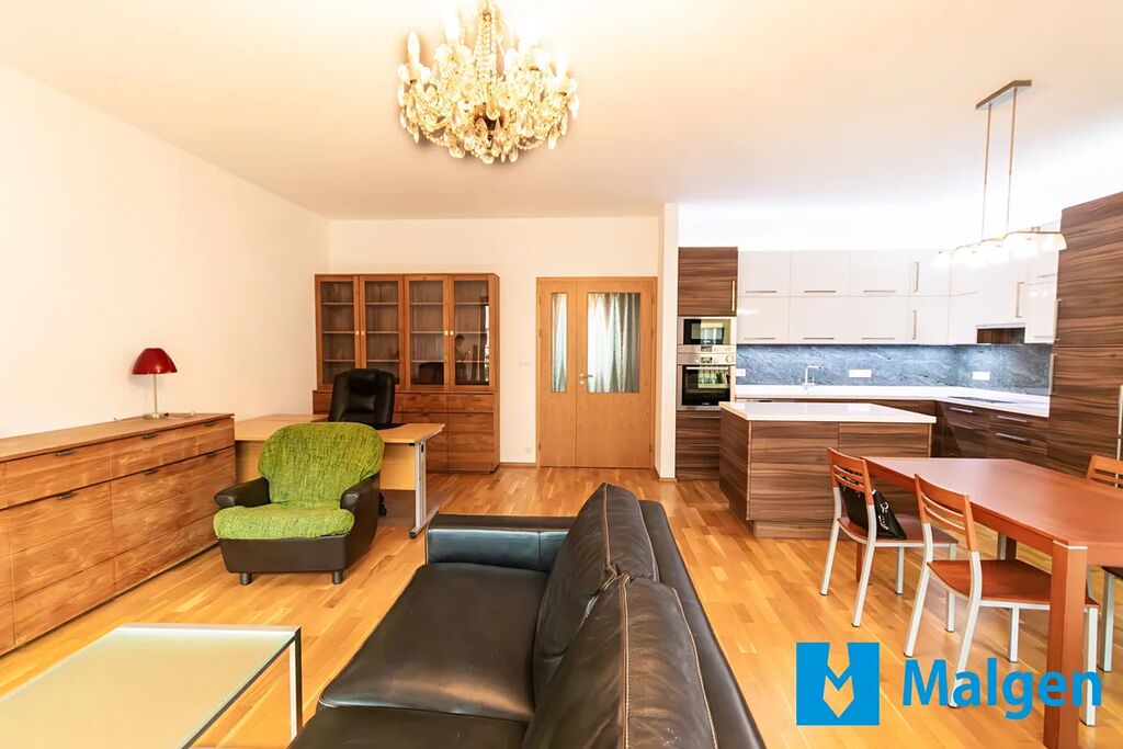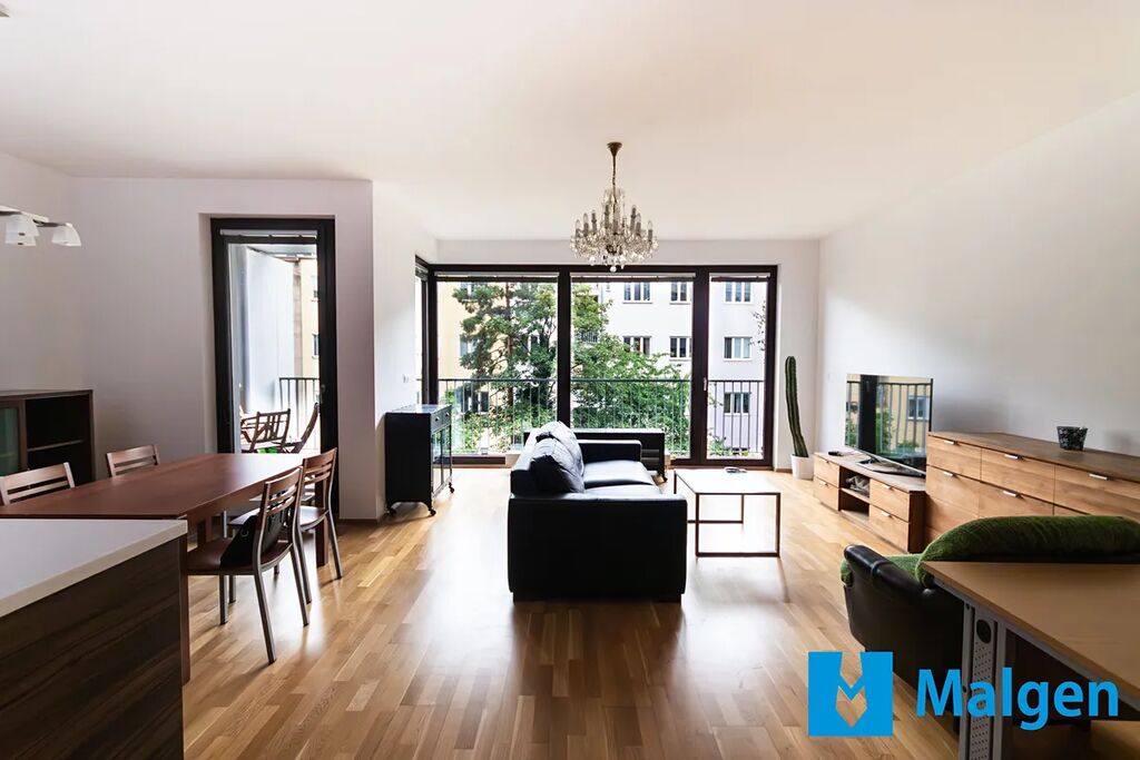 Nabízíme k pronájmu světlý, kompletně zařízený byt 3+kk o ploše 106 m² s 2 balkóny, umístěný ve 2. patře moderního rezidenčního komplexu s 24/7 recepcí, ostrahou, upraveným vnitroblokem a podzemním parkováním pro 2 auta v prestižní lokalitě Vinohrad.