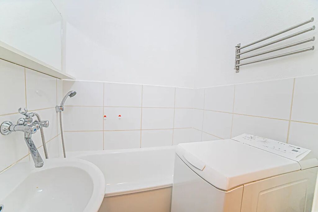 Původní bytové jádro, koupelna s vanou a pračkou.