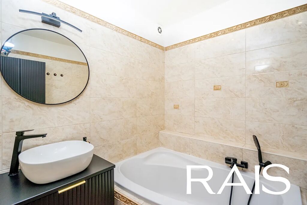 Ze vstupní haly, která slouží zároveň jako šatna, je přístupna luxusní koupelna s rohovou vanou. Toaleta s umyvadlem je řešena také jako samostatná místnost. Následuje poté prostorná kuchyně s jídelním koutem a na míru navrženou kuchyňskou linkou se zabudovanými spotřebiči, která zajistí budoucímu majiteli dostatek prostoru k vaření či uložení nádobí. Z kuchyně je přístupný prostorný balkon. Ze vstupní haly se dostanete do ložnice s vestavěnými skříněmi. Na obývací pokoj navazuje prosvětlená pracovna, kterou lze využít i jako dětský pokoj. Bytová jednotka působí velice pozitivním světlým dojmem, přičemž z oken jsou krásné výhledy do okolí.