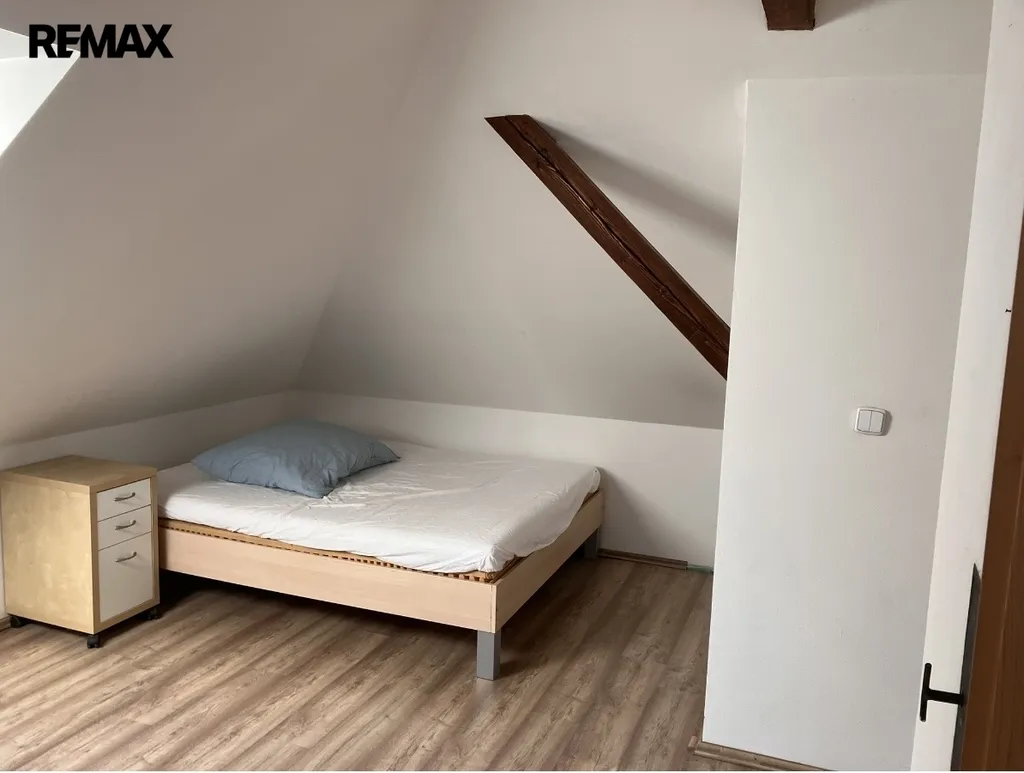 dva pokoje,kuchyňská linka, koupelna s WC a dále pak dalšími půdními prostory které navazují a jdou tak rozšířit o další pokoje případně pro jiné využití.