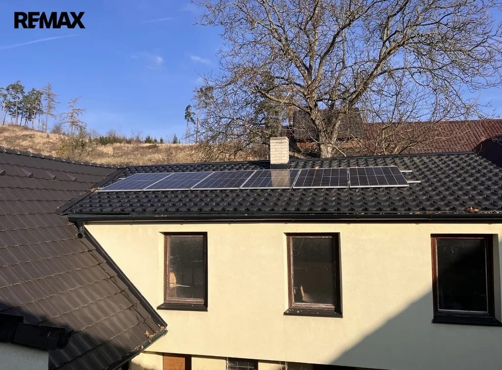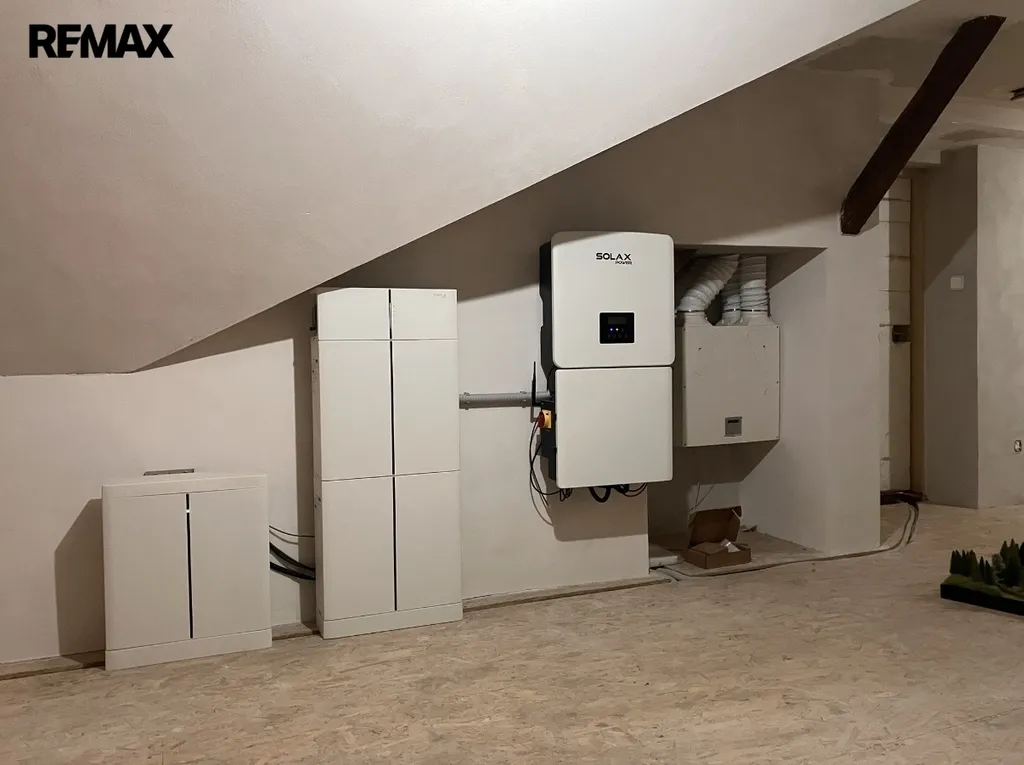 Vytápění ústřední plynové-kotel je zde i dále možnost využití vytápění kotlem na tuhá paliva a v některých částech domu je vytápění podlahové. Ohřev vody přes solární panely, rekuperace vzduchu. Dům je dále vybaven FVE elektrárnou o výkonu 5kWP a baterií 9kWh což zaručuje minimální náklady na provoz domu.