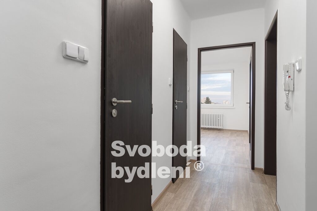 Vstupní dveře vedou do předsíně (cca 3,4m2), ze které se vchází do jednotlivých místností. Po pravé straně vejdeme do ložnice (cca 12m2) se vstupem na lodžii (cca 3m2) a do obývacího pokoje (cca 19m2), na který navazuje kuchyňský kout. Další ložnice (cca 13m2) se nachází po levé straně předsíně. V čele předsíně nalezneme koupelnu a samostatnou toaletu. Pro přehlednou dispozici bytu doporučujeme shlédnutí podrobné virtuální prohlídky, plánek je poskytován bez záruky, míry a rozměry jsou orientační.