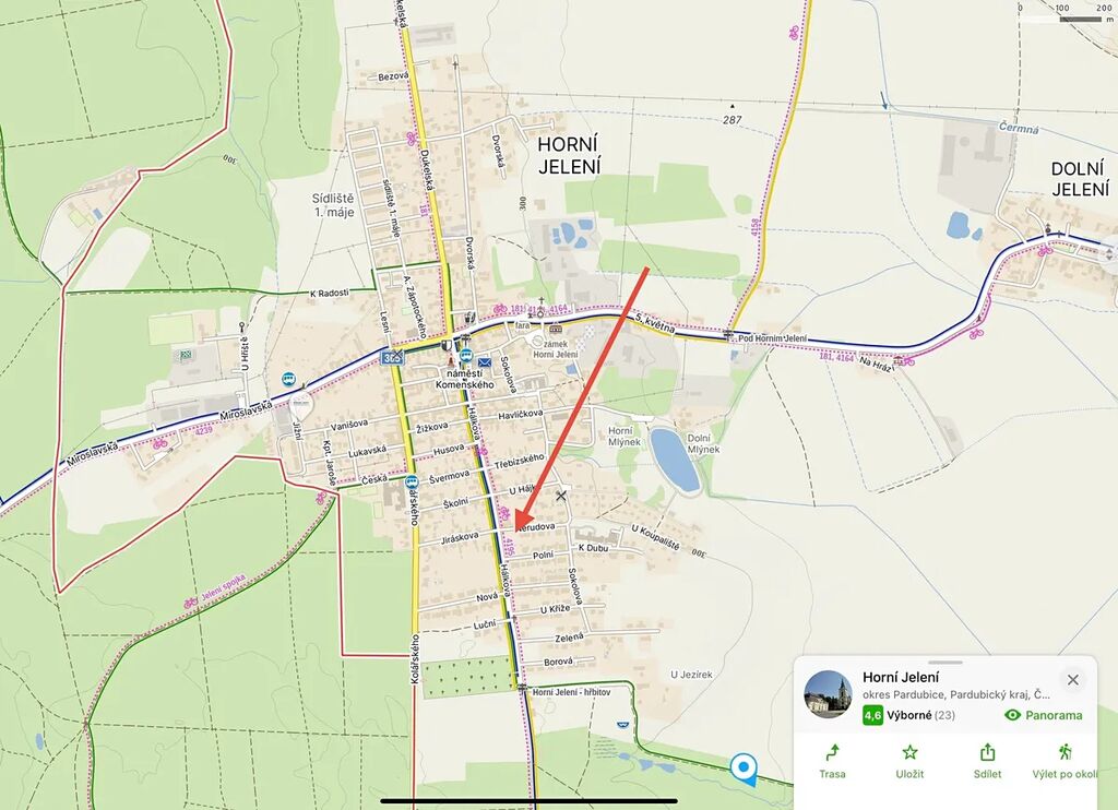 Horní Jelení se nachází v okrese Pardubice a nabízí ideální kombinaci klidu venkova a dostupnosti městské infrastruktury. V obci najdete školu, školku, obchody, restaurace a další občanskou vybavenost. Okolí je vhodné pro rodinný život i rekreaci – krásná příroda, lesy a cyklostezky v dosahu.