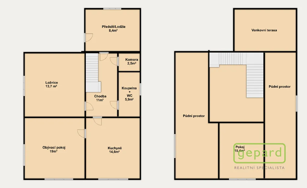 První patro: jeden prostorný pokoj a dva pokoje - půdní prostory, které jsou aktuálně využívané k uskladnění věcí. Po rekonstrukci lze v patře vybudovat až tři plnohodnotné pokoje.