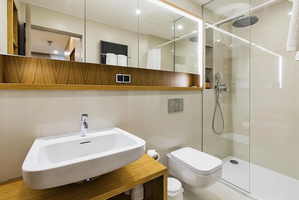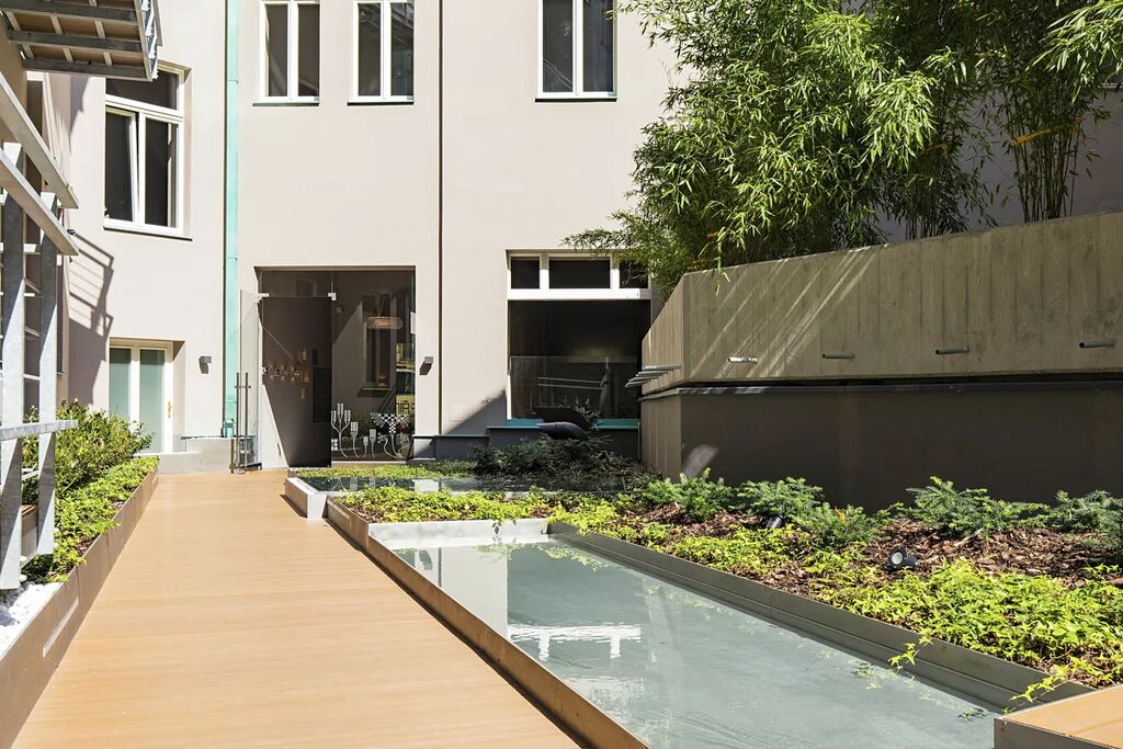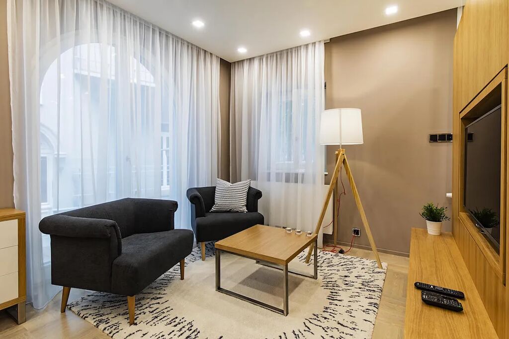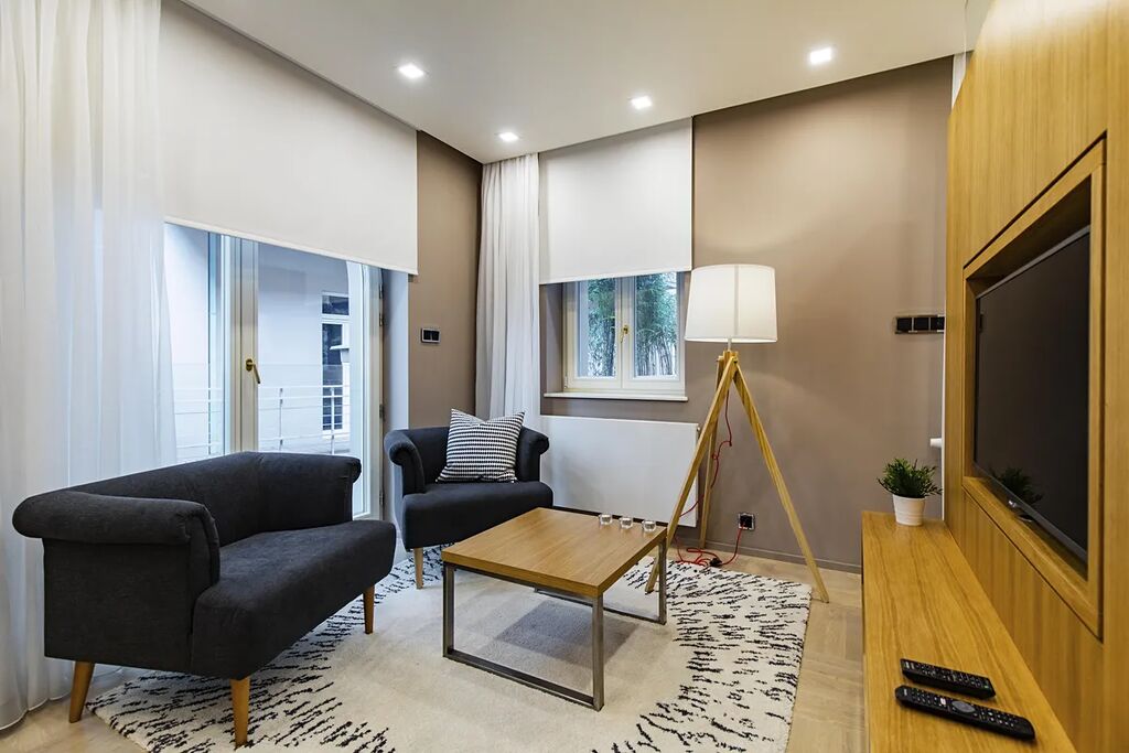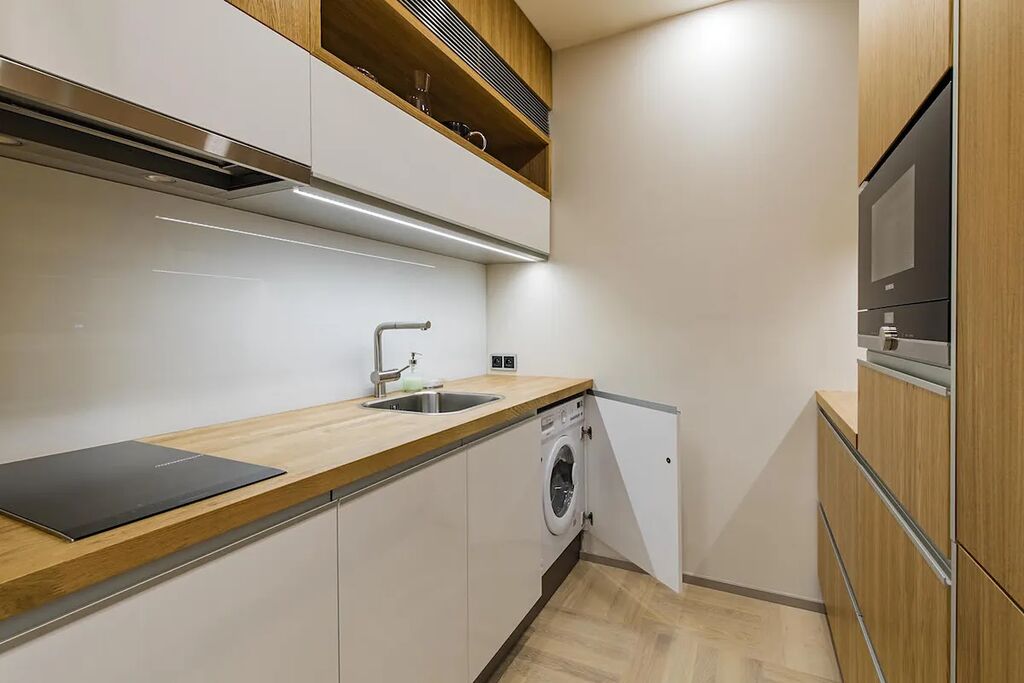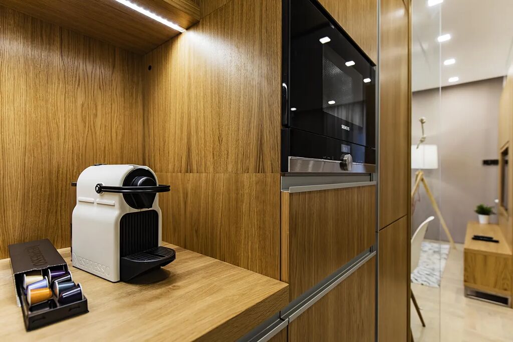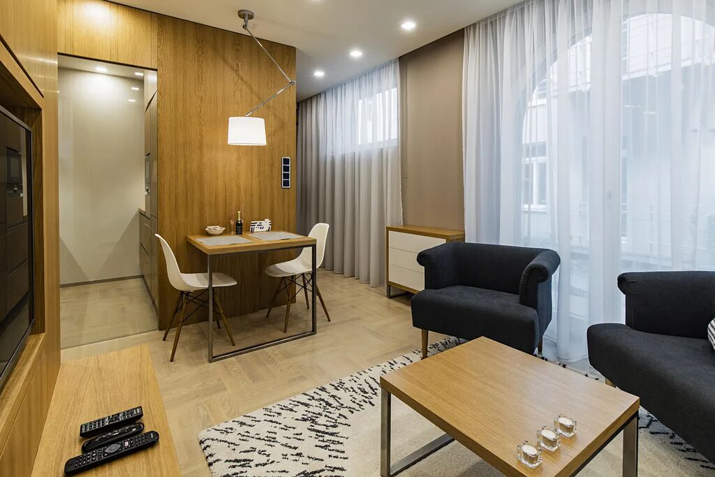 Byt se nachází v zeleném vnitrobloku residence a je velmi tichý. Mezi hlavní vybavení tohoto patří klimatizační jednotka Mitsubishi, eurookna s trojskly, jež jsou stíněny dálkově ovládanými blackout roletami, parkety z běleného dubu skládané do čtverců, kompletní interiér z dubu, skla a nerezu, kuchyňské spotřebiče Miele - varná deska, lednice s mrazákem, trouba, kombinovaná pračka se sušičkou. V obývací části je na otočném panelu umístěna smart TV s Netflix, audio přehrávač Sony.