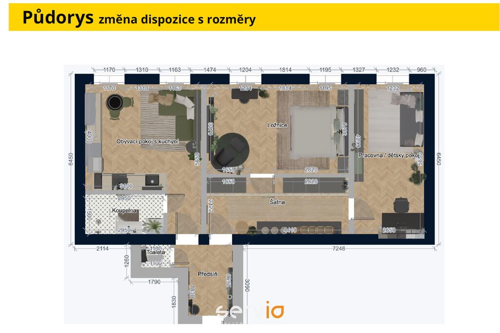 Obývací pokoj s kuchyní: 19,5 m2, ložnice: 18 m2, pokoj: 15 m2, šatna: 11 m2, koupelna 4,5 m2.