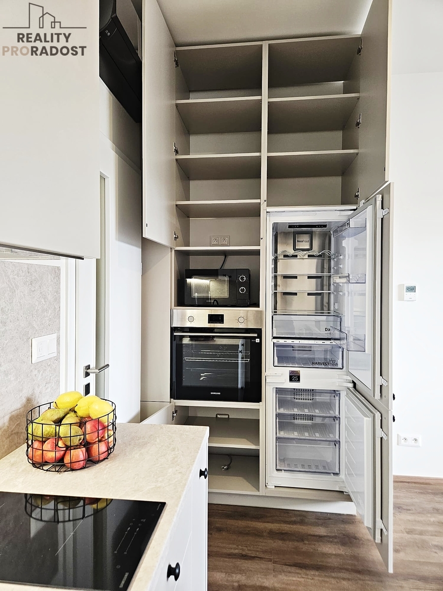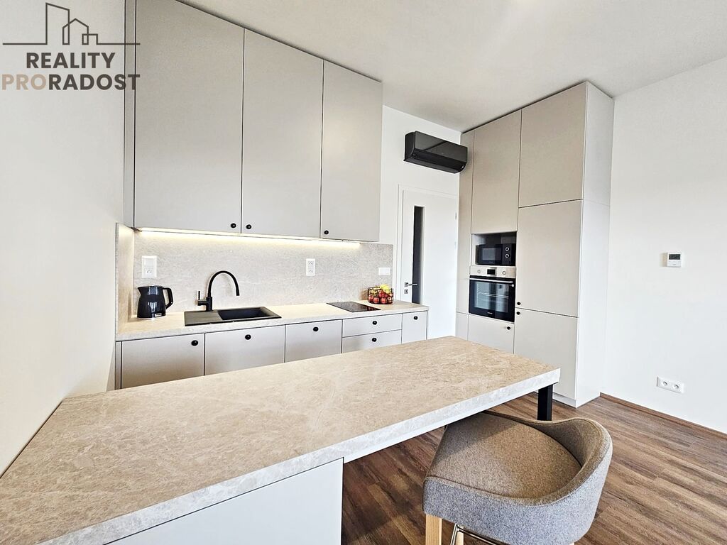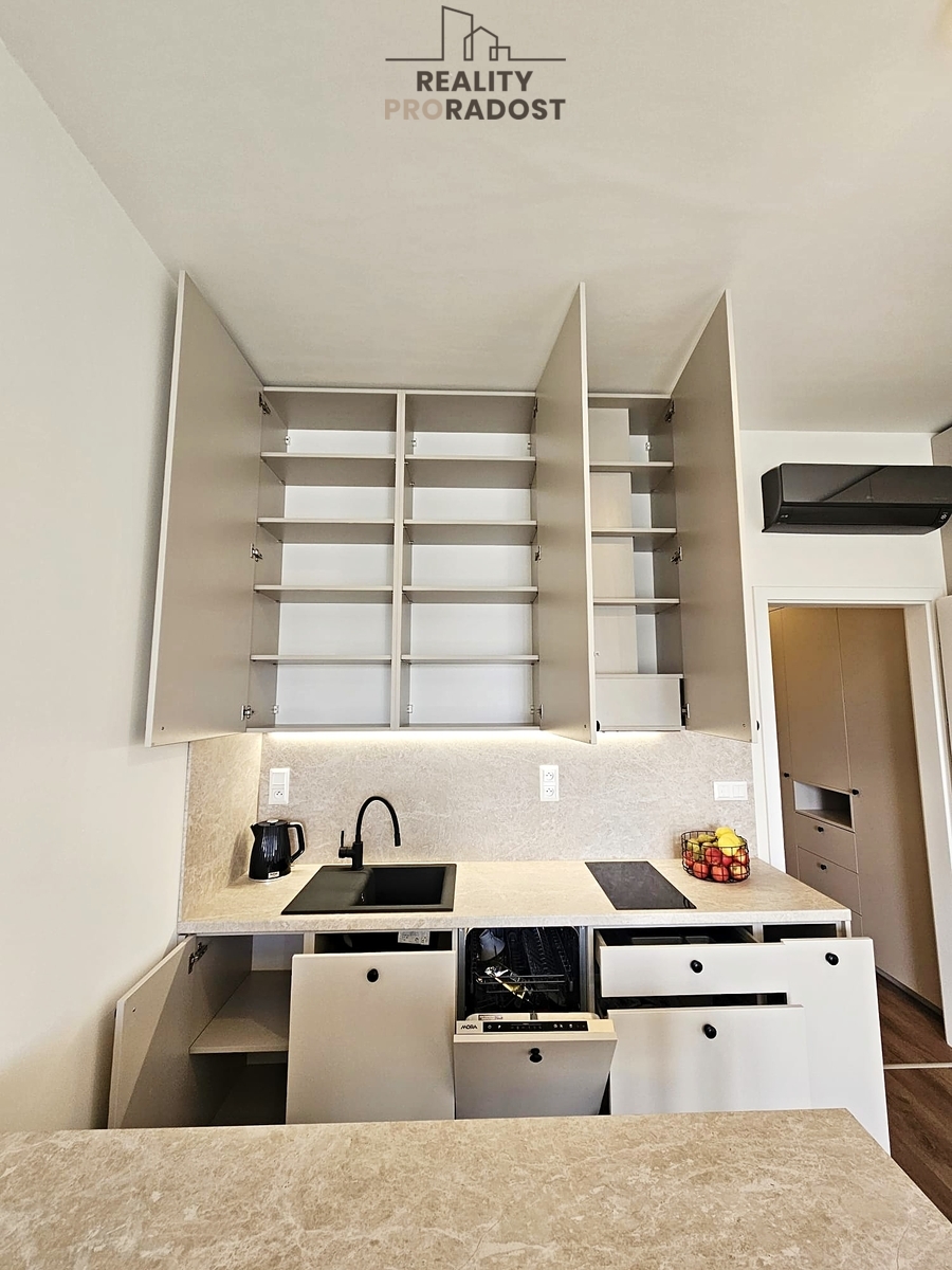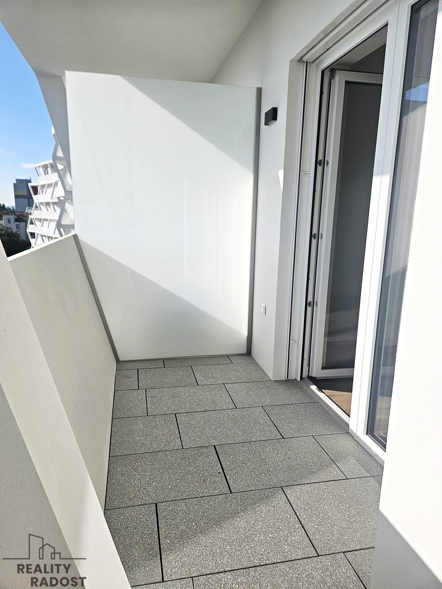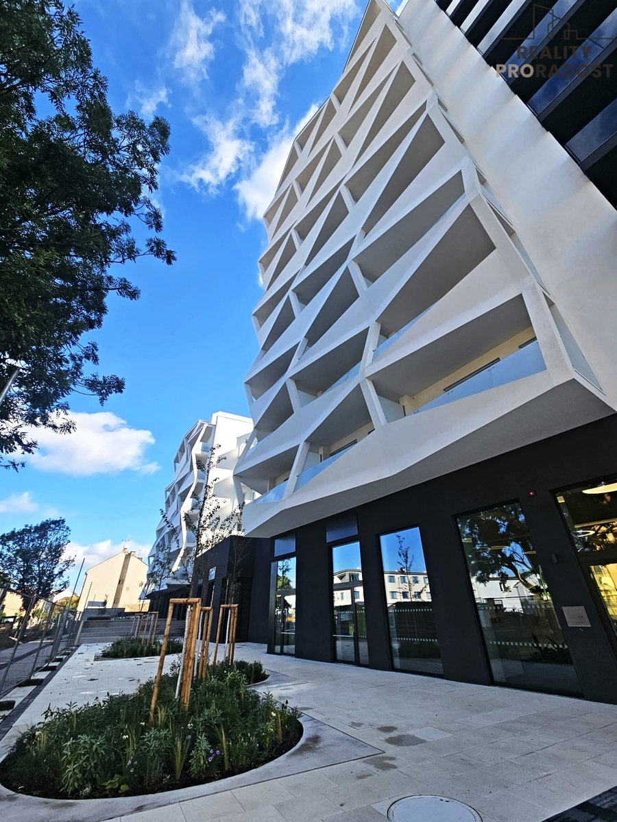 Nová bytová jednotka o celkové výměře 40,1 m2 vč. terasy (5,6 m2) se nachází ve 4.p./6. budovy s výtahem, je orientovaná na východ a nabízí komfortní bydlení s výhodou prvního nájemce v moderní budově s nevšední fasádou. Je částečně zařízená nábytkem na míru, vestavěnými spotřebiči, klimatizací a předokenními roletami. Prostornost a světlost bytu dokresluje výška stropu 3 m, která je plně využitá u veškerého vestavěného nábytku.