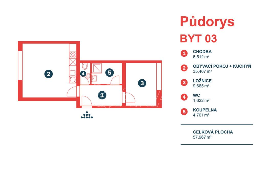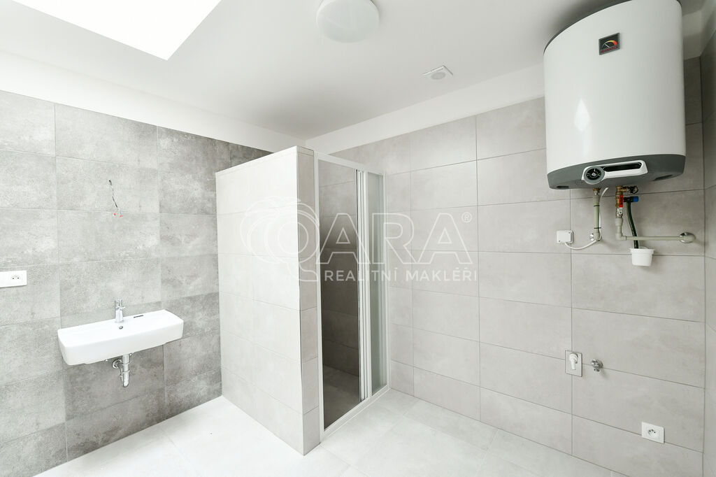Byt o celkové výměře 58 m² je prakticky vyřešen a tvoří jej: vstupní chodba, koupelna se sprchovým koutem, samostatné WC, obývací pokoj s kuchyňským koutem a velkoformátovým oknem a 1x ložnice. V bytě je položena plovoucí podlaha, v koupelně je dlažba. Byt se pronajímá zařízen kuchyňskou linkou včetně vestavěných spotřebičů (myčka, trouba, varná deska), digestoří a lednicí. Celý objekt je vytápěn tepelným čerpadlem, v bytech pak je instalováno podlahové topení. Ohřev teplé vody zajišťuje boiler umístěný v koupelně.