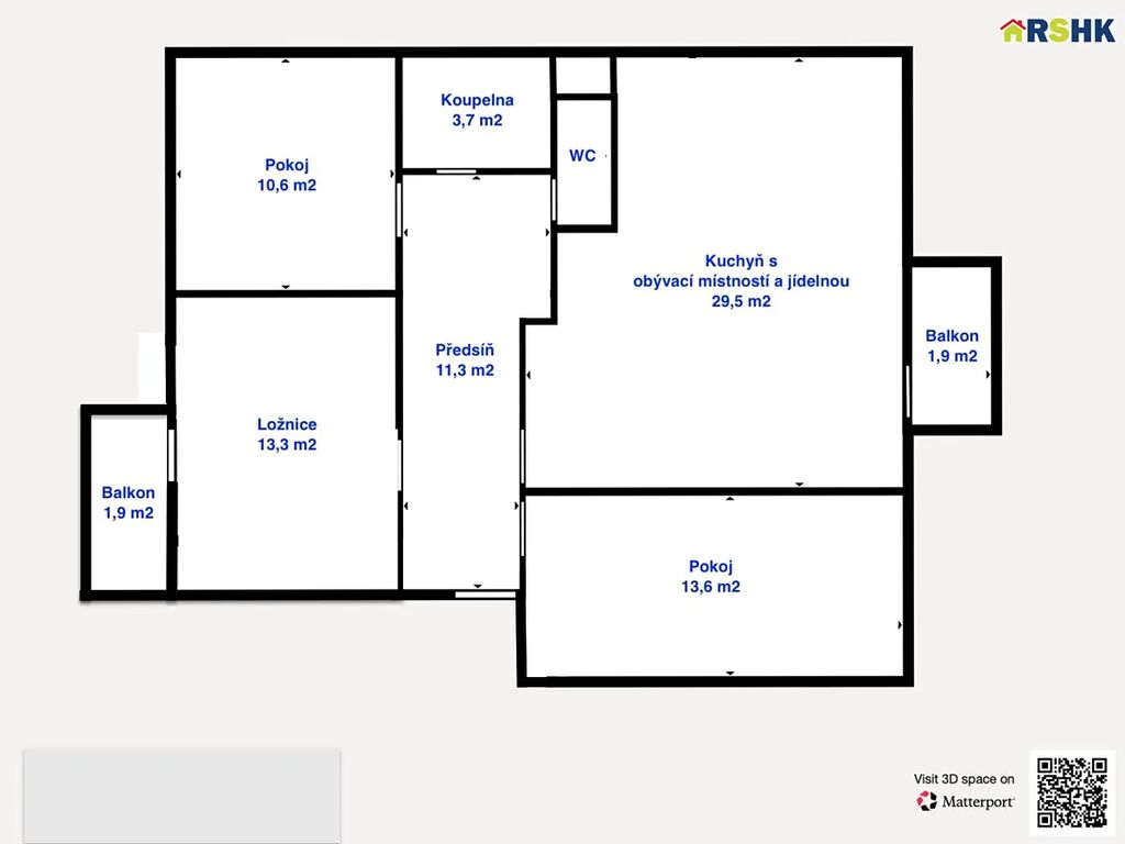 2 balkóny — jeden z obývacího pokoje, druhý přímo z ložnice
