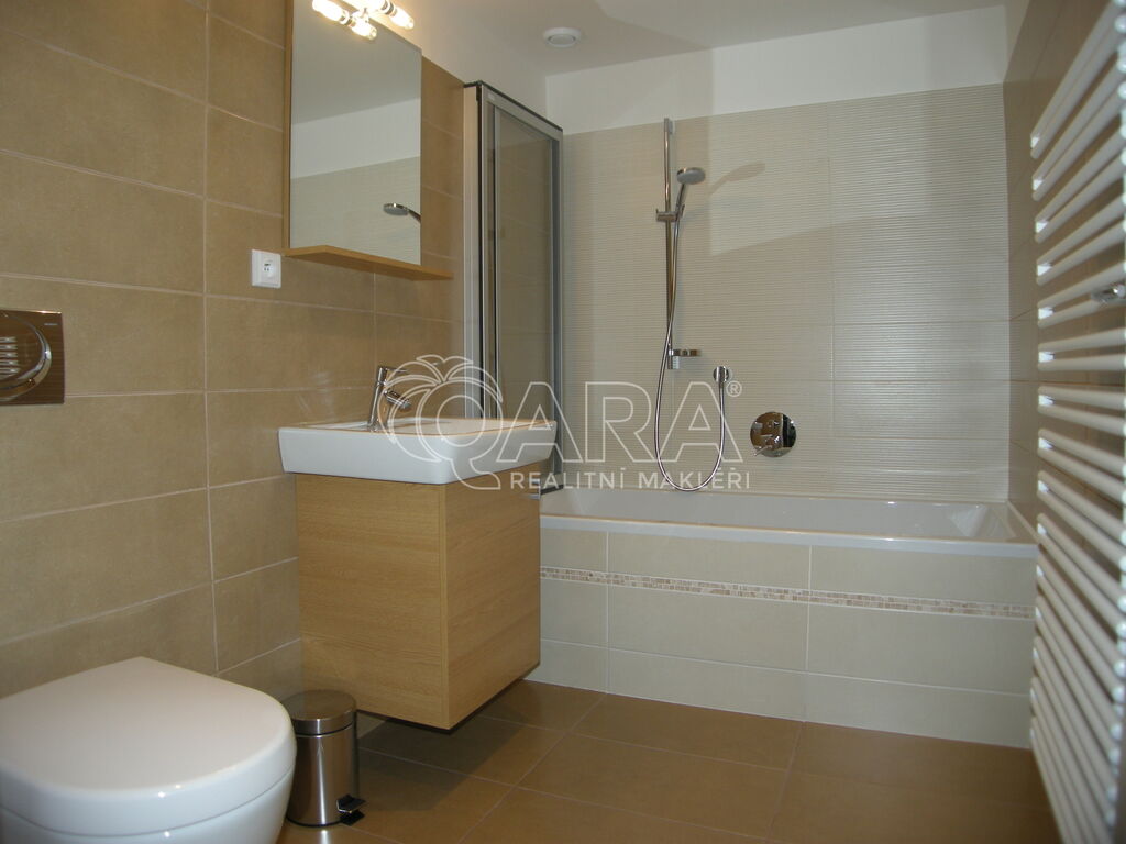 V koupelně je sanita Villeroy Boch, baterie Hansgrohe a koupelnový nábytek, k vytápění slouží samostatný plynový kotel, k vybavení patří také pračka a sušička.