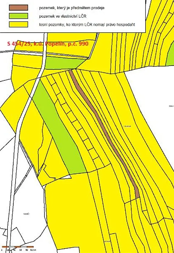 Jedná se o prodej lesního pozemku parc. č. 990 o výměře 4409 m2, úzkého protáhlého a nepravidelného tvaru, uvnitř velkého lesního útvaru tvořeném pozemky jiných vlastníků, zarostlého převážně listnatými stromy a keři.
