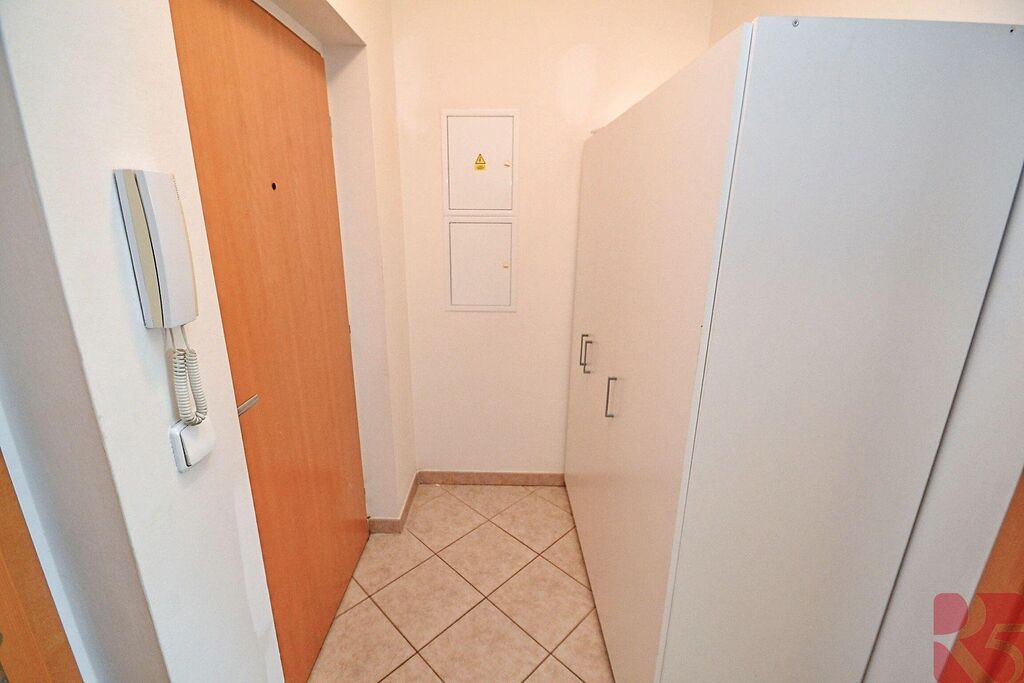 V bytě vstupní chodba s dlažbou a zrcadlem. Z chodby vstup do koupelny a pokoje..
