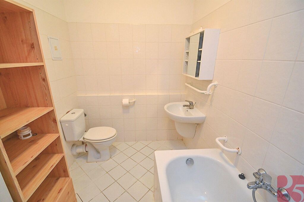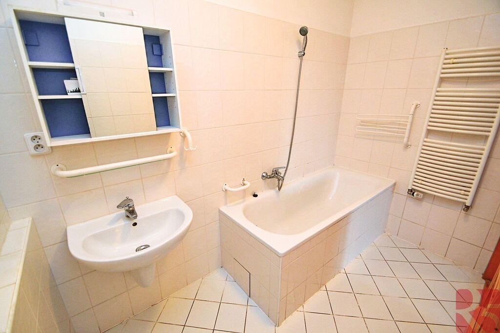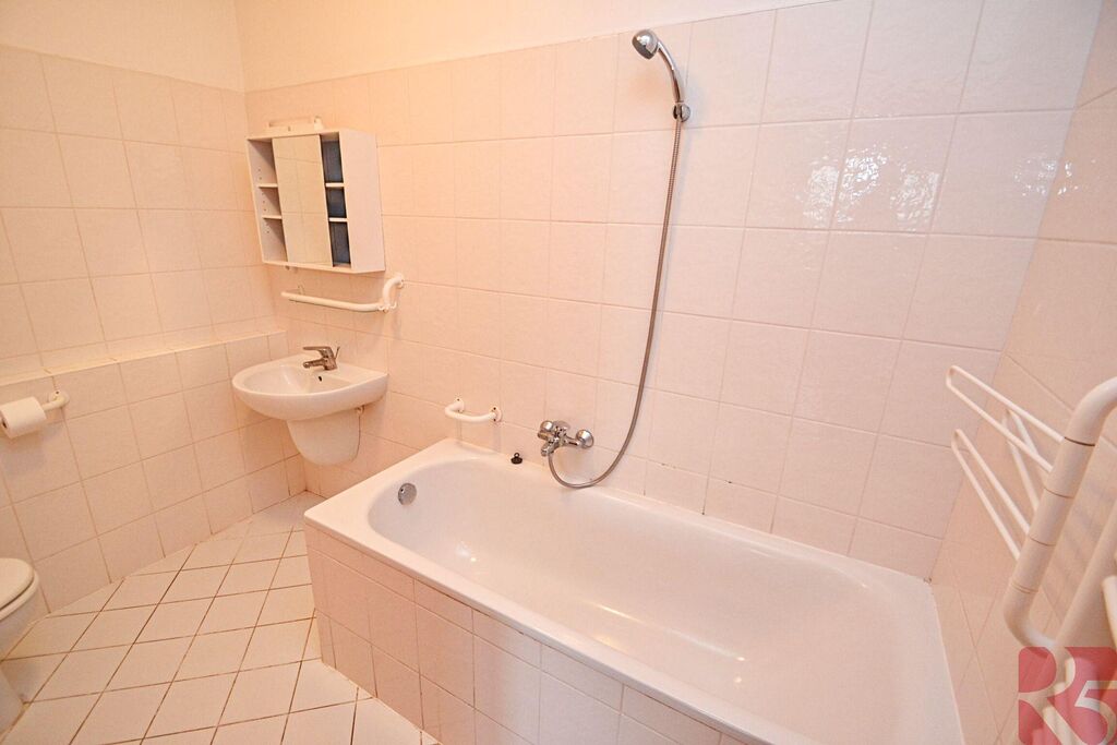V koupelně dlažba, vana, toaleta, přípojka na pračku a žebřinové topení.