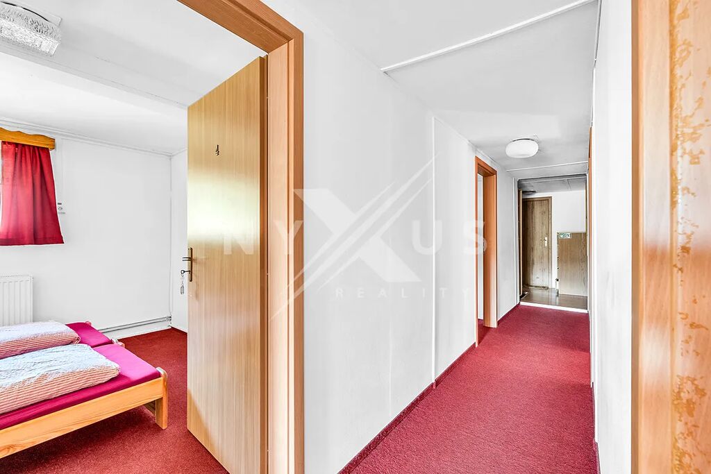 Hlavní, větší dům je momentálně využíván jako penzion, ale lze ho snadno přizpůsobit pro rodinné bydlení či rekreaci. Dispozice přízemí zahrnuje halu, kuchyni, společenskou místnost a dva pokoje s vlastními koupelnami a WC. Dále se zde nachází samostatné WC a sklad pro lyže či kola. V patře domu jsou dvě koupelny a WC, šest pokojů a samostatný apartmán 2 (3) + 1 s koupelnou, vanou a WC, ze kterého je krásný výhled na přilehlý splav. Dům byl částečně modernizován, což zahrnuje zavedení plynu, nové rozvody vody a elektřiny, výměnu většiny oken a nové okapy. Součástí domu je prostorný kamenný sklep a vnější plášť domu je vhodný pro rekonstrukci.